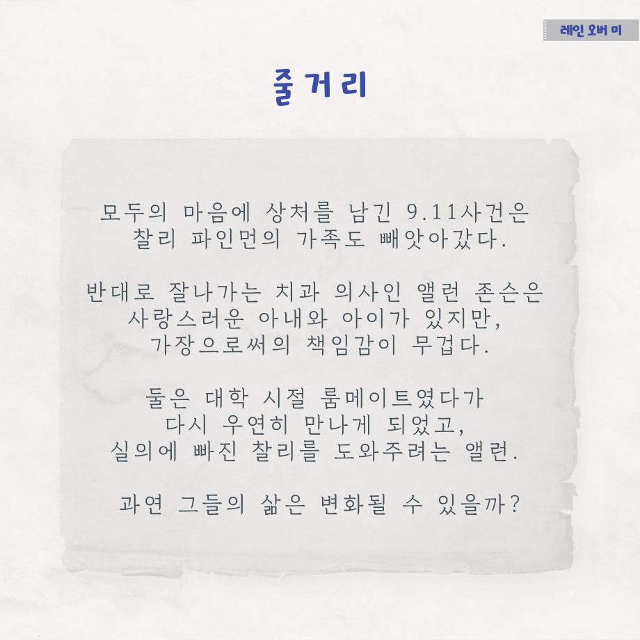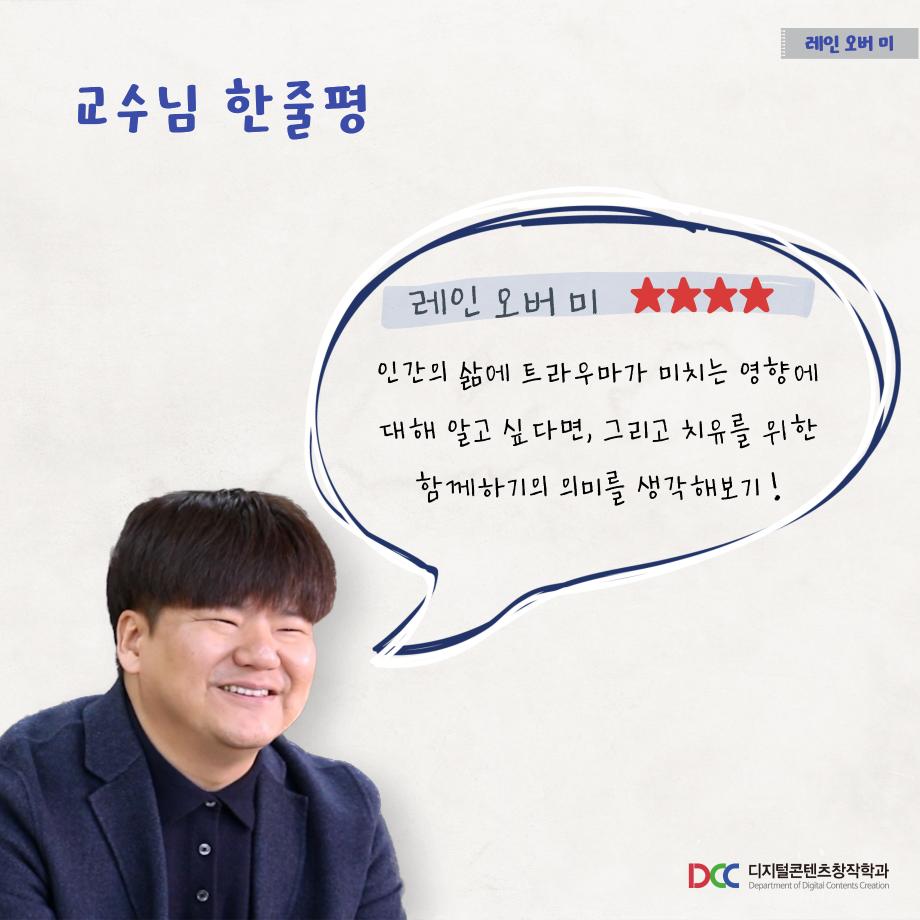 본문 시작 홈으로 MCC News 학과소개 교수소개 학과과정 MCC News MCC SNS 홈페이지가이드 학과 및 재학생 학과 및 재학생 교수 및 졸업생 미디어 정보통 학과 및 재학생 페이스북 트위터 프린트 디콘창이 추천하는 영화 추천 6선 1탄 디지털콘텐츠창작학과 4219 2022-12-08 세명대학교 디지털콘텐츠창작학과가 추천하는 영화 추천 6선 시리즈가 시작됩니다! 1탄의 추천 영화는 ‘레인 오버 미’입니다 😃 영화 추천 시리즈에서는 추천 영화의 줄거리, 스틸컷, 감상 가능한 사이트, 교수님의 한줄평까지 한눈에 볼 수 있습니다. 짧지만 알찬 정보는 담았으니, 다양한 장르의 추천 영화를 감상해 보시고 여러분들의 한줄평을 남겨주세요! 앞으로 올라올 5편도 학우분들의 많은 관심 부탁드립니다❤ 목록 이전부산중구스토리공모전-디지털콘텐츠창작학과 학생 5명 수상 다음 제20회 DCC콘텐츠페스티벌 사진첩 1탄! 담당부서 : 미디어콘텐츠창작학과 담당자 : - 연락처 : 043-649-1741 최종수정일 : 2024-10-26 만족도조사 만족도 조사 이 페이지에서 제공하는 정보에 대하여 만족하시나요? 매우만족 만족 보통 불만족 매우불만족