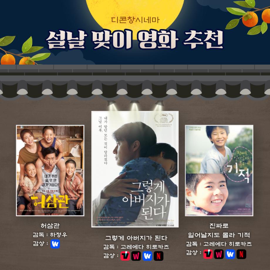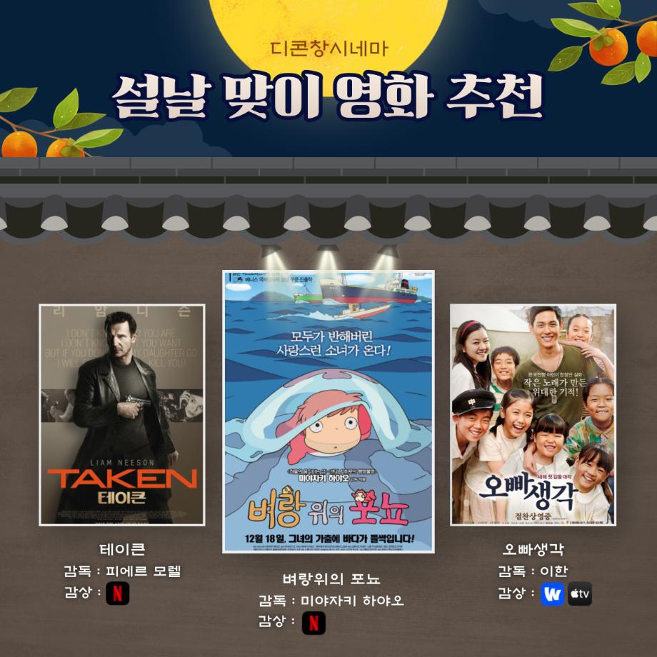 본문 시작 홈으로 MCC News 학과소개 교수소개 학과과정 MCC News MCC SNS 홈페이지가이드 학과 및 재학생 학과 및 재학생 교수 및 졸업생 미디어 정보통 학과 및 재학생 페이스북 트위터 프린트 설날 맞이 영화 추천 디지털콘텐츠창작학과 3963 2023-01-20 명절을 맞이해서 가족과 함께 볼 수 있는 영화를 추천해 드려요! 이번 설에는 가족과 함께 영화를 보는 건 어떨까요? 목록 이전🍭 오늘의 디콘 11탄 🍭 다음 세명인이라면 알아야 할 꿀팁 앱 담당부서 : 미디어콘텐츠창작학과 담당자 : - 연락처 : 043-649-1741 최종수정일 : 2024-10-26 만족도조사 만족도 조사 이 페이지에서 제공하는 정보에 대하여 만족하시나요? 매우만족 만족 보통 불만족 매우불만족