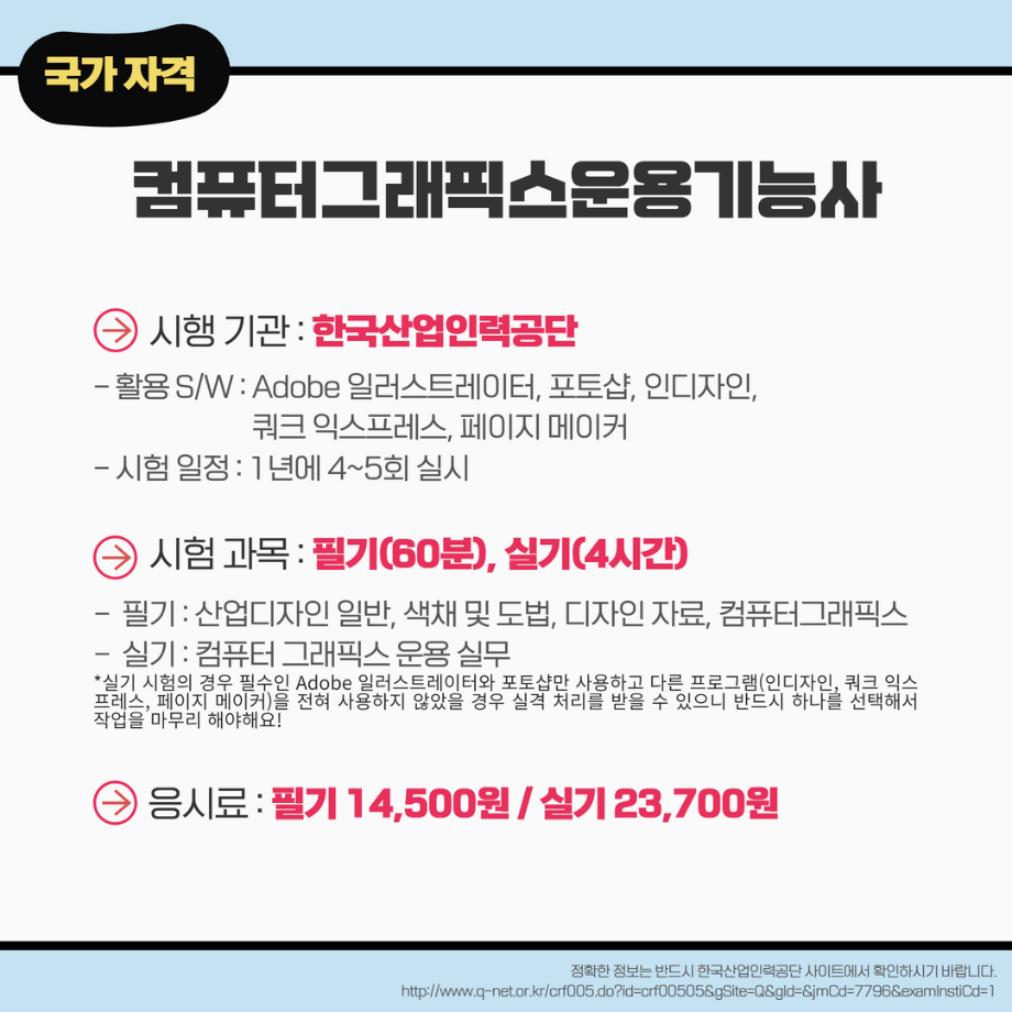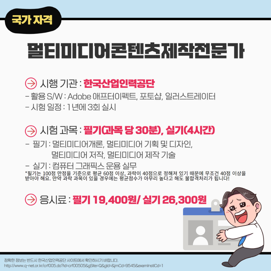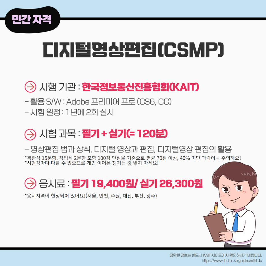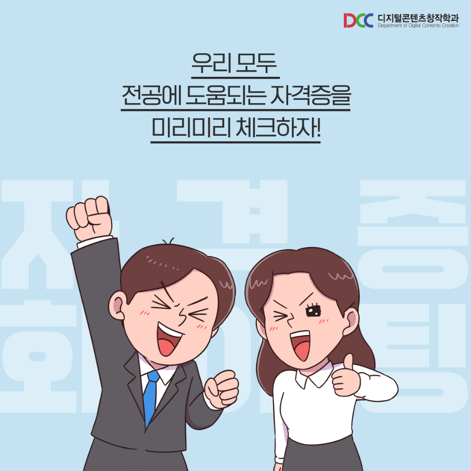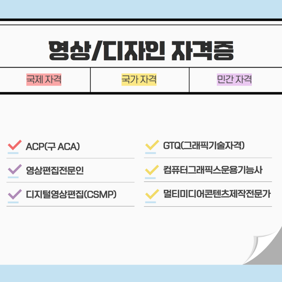 본문 시작 홈으로 MCC News 학과소개 교수소개 학과과정 MCC News MCC SNS 홈페이지가이드 학과 및 재학생 학과 및 재학생 교수 및 졸업생 미디어 정보통 학과 및 재학생 페이스북 트위터 프린트 미리 취득하면 도움 되는 자격증📝 디지털콘텐츠창작학과 4678 2023-03-14 영상, 디자인 관련 자격증을 알려드립니다! 자격증은 국제/국가/민간으로 나뉘며 총 6개의 자격증이 있습니다! 각 전공에 도움되는 자격증을 미리 확인하여 취득할 수 있는 기회를 놓치지 마세요! 목록 이전인문예술대학 특강 안내 (장정민 모델러 초청 특강) 다음 ✨디콘창 밸런스 게임✨ 담당부서 : 미디어콘텐츠창작학과 담당자 : - 연락처 : 043-649-1741 최종수정일 : 2024-10-26 만족도조사 만족도 조사 이 페이지에서 제공하는 정보에 대하여 만족하시나요? 매우만족 만족 보통 불만족 매우불만족