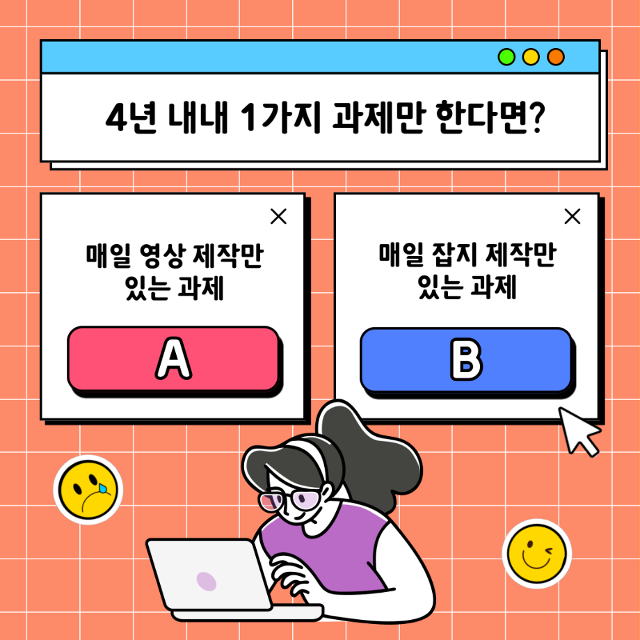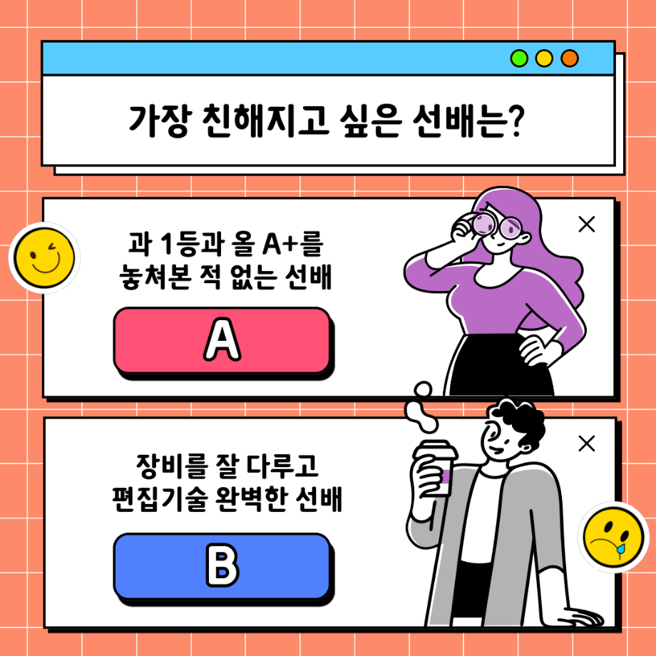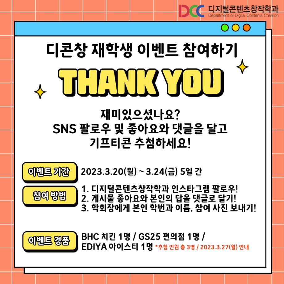 본문 시작 홈으로 MCC News 학과소개 교수소개 학과과정 MCC News MCC SNS 홈페이지가이드 학과 및 재학생 학과 및 재학생 교수 및 졸업생 미디어 정보통 학과 및 재학생 페이스북 트위터 프린트 ✨디콘창 밸런스 게임✨ 디지털콘텐츠창작학과 4743 2023-03-20 디지털콘텐츠창작학과 밸런스 게임을 준비했습니다! 여러분의 선택을 댓글로 알려주세요! 디콘창 재학생 이벤트로 진행하고 있으니 많은 참여 부탁드립니다! ❗이벤트 참여 방법❗ 1. 디지털콘텐츠창작학과 인스타그램 팔로우 2. 게시물 좋아요와 본인의 답을 댓글로 달기 3. 학회장에게 본인 학번과 이름, 참여 사진 보내기 목록 이전미리 취득하면 도움 되는 자격증📝 다음 🍭 오늘의 디콘 13탄 🍭 담당부서 : 미디어콘텐츠창작학과 담당자 : - 연락처 : 043-649-1741 최종수정일 : 2024-10-26 만족도조사 만족도 조사 이 페이지에서 제공하는 정보에 대하여 만족하시나요? 매우만족 만족 보통 불만족 매우불만족
