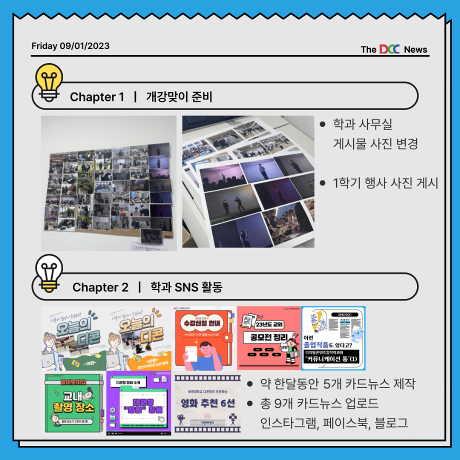 본문 시작 홈으로 MCC News 학과소개 교수소개 학과과정 MCC News MCC SNS 홈페이지가이드 학과 및 재학생 학과 및 재학생 교수 및 졸업생 미디어 정보통 학과 및 재학생 페이스북 트위터 프린트 📝디콘창 학생회 8월 월말결산 디지털콘텐츠창작학과 6653 2023-09-01 학생회가 하는 일이 궁금하시다고요? “디콘창 학생회 월말 결산”을 통해 학생회가 무슨 일을 했는지 알려드립니다🤗 매달 마지막 주에 업로드될 예정이니 많은 관심 부탁드려요!! 목록 이전디콘창이 추천하는 영화 추천 6선 6탄 다음 디지털콘텐츠창작학과, 장학금 마련을 위한 양심책방 운영 담당부서 : 미디어콘텐츠창작학과 담당자 : - 연락처 : 043-649-1741 최종수정일 : 2024-10-26 만족도조사 만족도 조사 이 페이지에서 제공하는 정보에 대하여 만족하시나요? 매우만족 만족 보통 불만족 매우불만족