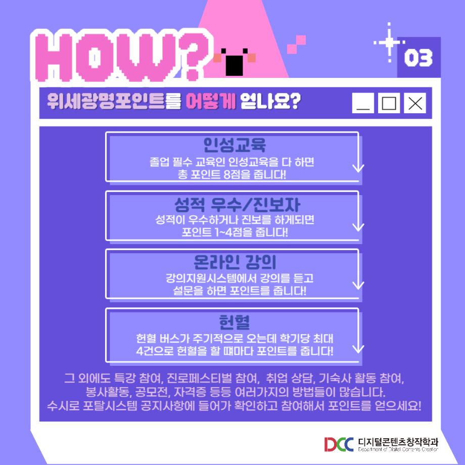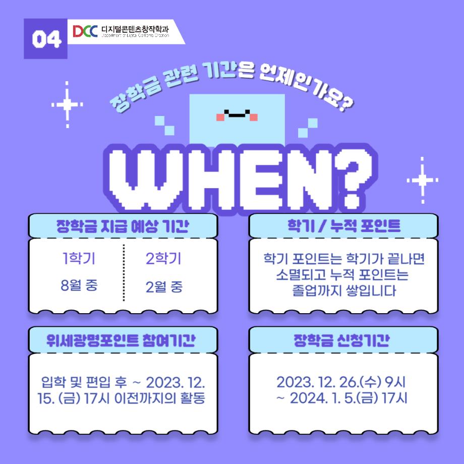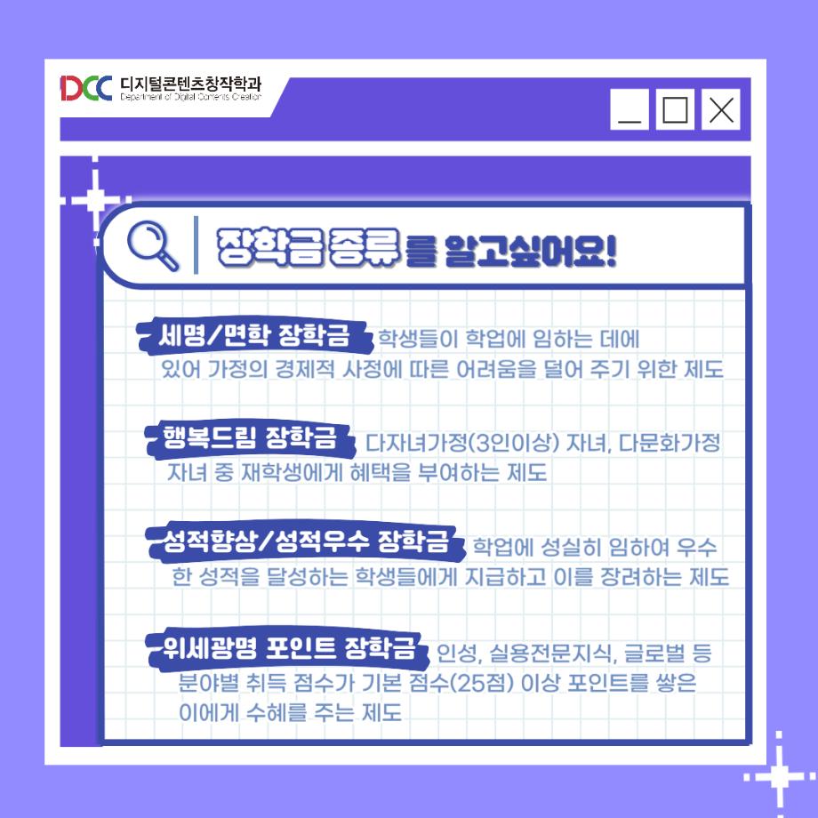 본문 시작 홈으로 MCC News 학과소개 교수소개 학과과정 MCC News MCC SNS 홈페이지가이드 학과 및 재학생 학과 및 재학생 교수 및 졸업생 미디어 정보통 학과 및 재학생 페이스북 트위터 프린트 장학금 받는 꿀팁🎓 디지털콘텐츠창작학과 6052 2023-10-20 장학금 받는 꿀팁🎓 학생회가 알려주는 장학금 받는 꿀팁❗ 장학금 종류뷰터 지급기간까지 알려드려요! 목록 이전학생회가 알려주는 재학생 할인 혜택 다음 디콘창 학생회 소개🤗 담당부서 : 미디어콘텐츠창작학과 담당자 : - 연락처 : 043-649-1741 최종수정일 : 2024-10-26 만족도조사 만족도 조사 이 페이지에서 제공하는 정보에 대하여 만족하시나요? 매우만족 만족 보통 불만족 매우불만족