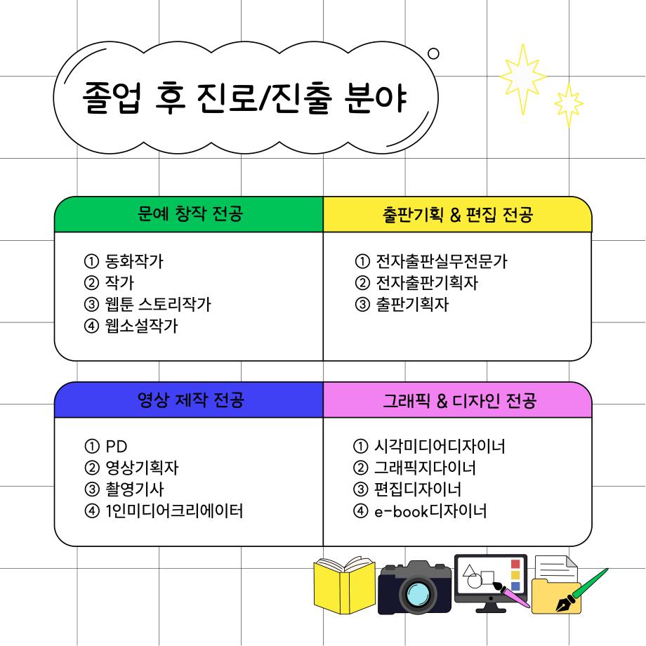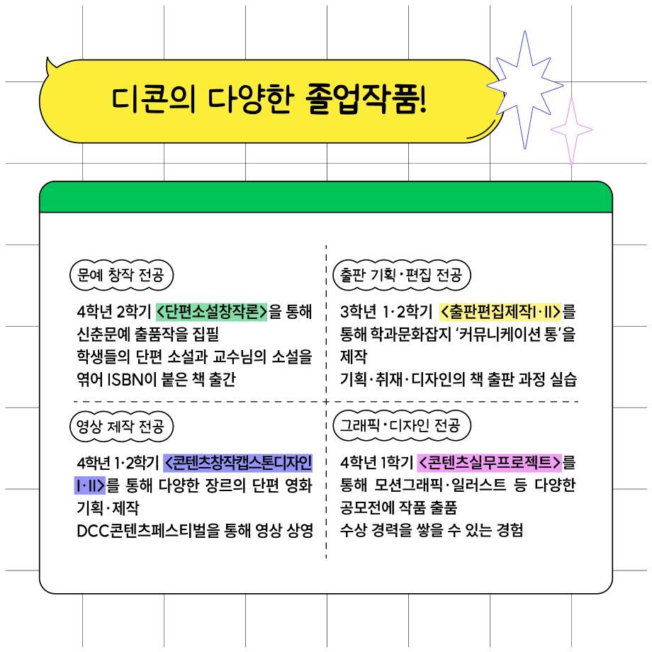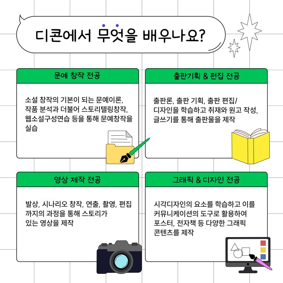 본문 시작 홈으로 MCC News 학과소개 교수소개 학과과정 MCC News MCC SNS 홈페이지가이드 학과 및 재학생 학과 및 재학생 교수 및 졸업생 미디어 정보통 학과 및 재학생 페이스북 트위터 프린트 디지털콘텐츠창작학과를 알고 싶다고? 디지털콘텐츠창작학과 6932 2023-12-29 디지털콘텐츠창작학과를 알고 싶은 예비신입생을 위해 준비했습니다! 디콘에서는 무엇을 배우는지, 어떤 졸업작품을 만드는지 등 궁금한 점을 정리해두었으니 참고하시면 좋을 것 같아요 목록 이전🎞제21회 DCC콘텐츠페스티벌 4학년 졸업작품 상영회🎞 다음 멋진 작품을 뽐내봐! 2023 캡스톤디자인 경진대회 대상: 디지털콘텐츠창작학과 깻잎방범대 팀 담당부서 : 미디어콘텐츠창작학과 담당자 : - 연락처 : 043-649-1741 최종수정일 : 2024-10-26 만족도조사 만족도 조사 이 페이지에서 제공하는 정보에 대하여 만족하시나요? 매우만족 만족 보통 불만족 매우불만족