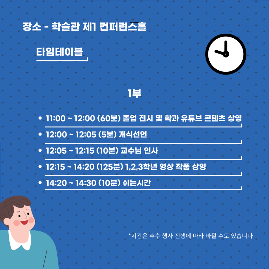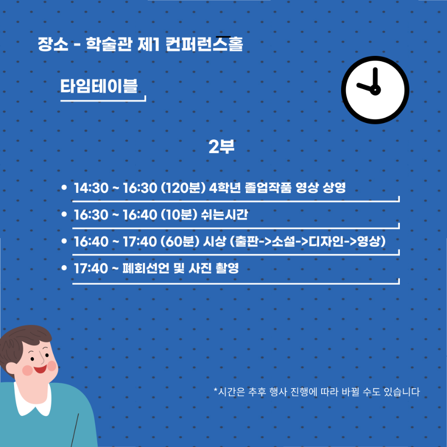 본문 시작 홈으로 MCC News 학과소개 교수소개 학과과정 MCC News MCC SNS 홈페이지가이드 학과 및 재학생 학과 및 재학생 교수 및 졸업생 미디어 정보통 학과 및 재학생 페이스북 트위터 프린트 🎊제22회 DCC 페스티벌🎊 미디어콘텐츠창작학과 2489 2024-11-27 디지털콘텐츠창작학과에서 학기 마지막 행사인 DCC페스티벌을 진행합니다! DCC 페스티벌은 1년동안 학과 학우분들이 제작한 영상, 소설, 디자인, 출판등을 전시 및 상영하는 행사이며 학과의 가장 큰 행사입니다. 일시 - 2024년 12월 3일 화요일 11시 장소 - 학술관 제1컨퍼런스홀 디지털콘텐츠창작학과 이름으로 하는 마지막 행사이자 학우여러분들의 1년동안의 과정, 성과를 볼 수 있는 행사이니 많은 관심과 참여 부탁드립니다! 목록 이전🕵🏻♂미디어콘텐츠창작학과 추리 방탈출🔎 다음 DCC 콘텐츠 페스티벌이 무사히 끝났습니다. 담당부서 : 미디어콘텐츠창작학과 담당자 : - 연락처 : 043-649-1741 최종수정일 : 2024-10-26 만족도조사 만족도 조사 이 페이지에서 제공하는 정보에 대하여 만족하시나요? 매우만족 만족 보통 불만족 매우불만족