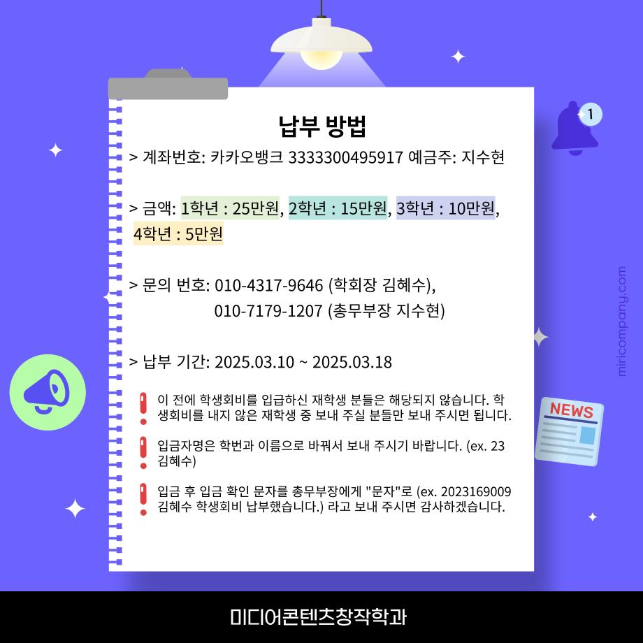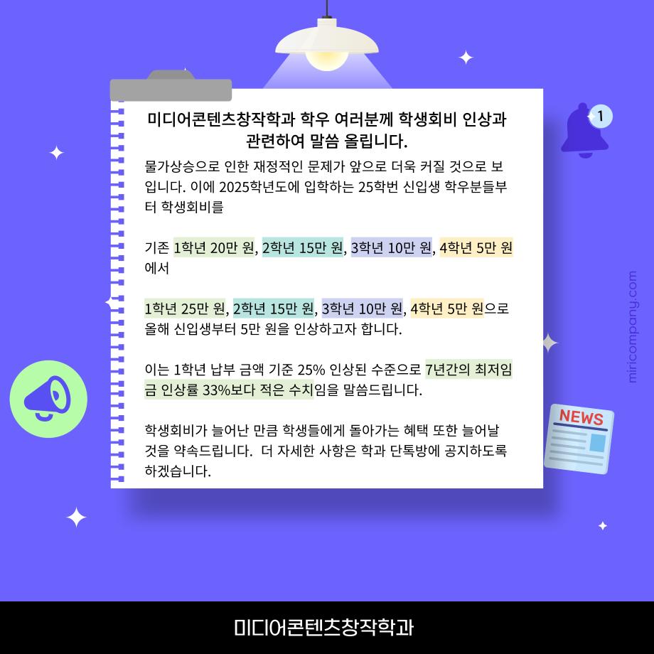 본문 시작 홈으로 MCC News 학과소개 교수소개 학과과정 MCC News MCC SNS 홈페이지가이드 학과 및 재학생 학과 및 재학생 교수 및 졸업생 미디어 정보통 학과 및 재학생 페이스북 트위터 프린트 ‼미디어콘텐츠창작학과 학생회비 안내 미디어콘텐츠창작학과 3355 2025-03-10 미디어콘텐텐츠창작학과에서 학생회비 인상과 납부 관련하여 안내드립니다. 더 자세한 사항은 과 단톡방을 통해 안내드리겠습니다. 문의사항이 있다면 카드뉴스에 적혀있는 학회장 또는 총무부장에게 연락바랍니다. 목록 이전‼️학생회 모집 안내 ‼️ 다음 🔥개총&신환회🎊 담당부서 : 미디어콘텐츠창작학과 담당자 : - 연락처 : 043-649-1741 최종수정일 : 2024-10-26 만족도조사 만족도 조사 이 페이지에서 제공하는 정보에 대하여 만족하시나요? 매우만족 만족 보통 불만족 매우불만족
