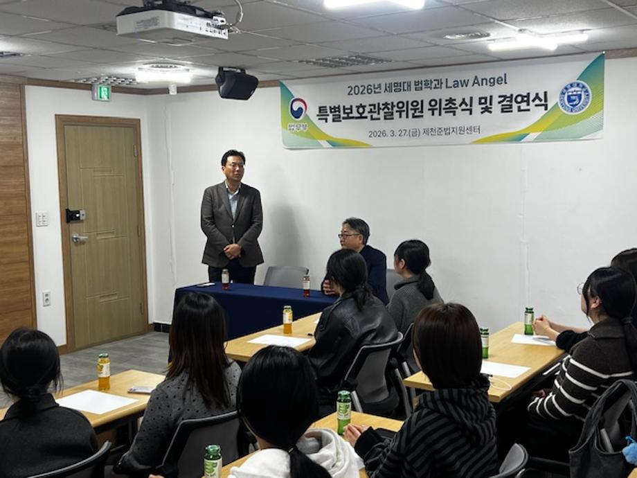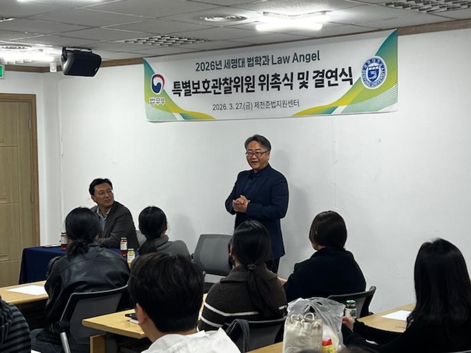 본문 시작 홈으로 커뮤니티 학과안내 교수소개 학과과정 커뮤니티 홈페이지가이드 학과사진첩 공지사항 취업정보 학과사진첩 학과행사 동아리 학생회 교우소식 학과사진첩 페이스북 트위터 프린트 2026. 03. 27. Law Angel 위촉식 법학과 66 2026-04-01 지난 3월 27(금) 15:30에 제천보호관찰소에서 로엔젤 학생들이 특별보호관찰위원 위촉식을 진행하였습니다. 목록 이전겨울방학 해외 배낭여행-푸꾸옥 담당부서 : 법학과 담당자 : - 연락처 : 043-649-1764 최종수정일 : 2024-10-26 만족도조사 만족도 조사 이 페이지에서 제공하는 정보에 대하여 만족하시나요? 매우만족 만족 보통 불만족 매우불만족