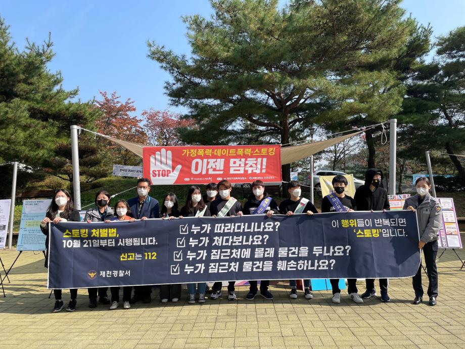 본문 시작 홈으로 커뮤니티 학과안내 교수소개 학과과정 커뮤니티 홈페이지가이드 학과사진첩 공지사항 취업정보 학과사진첩 학과행사 동아리 학생회 교우소식 학과사진첩 페이스북 트위터 프린트 PALETTE 데이트폭력과 스토킹행위 근절을 위한 캠페인 진행 법학과 3770 2021-10-26 세명대학교 법학과(학과장 장성원) 봉사동아리 PALETTE는 2021년 10월 26일(화) 교내 학생회관 앞에서 스토킹처벌법 시행을 맞아 데이트폭력과 스토킹행위 근절을 위한 캠페인을 진행하였다. 이 캠페인에는 세명대학교 인권서포터즈 ‘SMile’과 제천가정폭력상담소, 제천경찰서가 함께 참여하였다. 목록 이전HAN'S 심리상담센터와 상호 교류・협력 협약(MOU) 체결 다음 2021.11.02 경찰 공무원 특강 담당부서 : 법학과 담당자 : - 연락처 : 043-649-1764 최종수정일 : 2024-10-26 만족도조사 만족도 조사 이 페이지에서 제공하는 정보에 대하여 만족하시나요? 매우만족 만족 보통 불만족 매우불만족