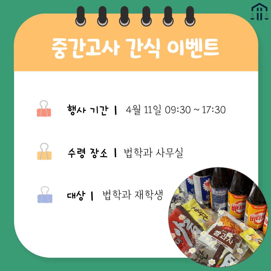 본문 시작 홈으로 커뮤니티 학과안내 교수소개 학과과정 커뮤니티 홈페이지가이드 학과사진첩 공지사항 취업정보 학과사진첩 학과행사 동아리 학생회 교우소식 학과사진첩 페이스북 트위터 프린트 🍫법학과 '하로'의 간식 이벤트🍫 법학과 5337 2023-04-11 🍫법학과 '하로'의 간식 이벤트🍫 🔔EVENT🔔 시험이 얼마 남지 않아서 힘들죠? 🤔 하로가 중간고사 기간 중 법학과 학생분들을 위해 '간식꾸러미'를 준비했어요! :) 소소하지만, 당충전하고 모두 힘내봅시다👍 ✔ 재고 소진 시까지 😆 ✔ 선착순 4월 11일 (화) 09:30~17:30 ✔ 1인 간식꾸러미1개, 음료수1개 세트‼ ✔ 학과 사무실로 오셔서 받아가시면 됩니다👏 목록 이전[법학과 축구동아리 DIKE] 이길 수 있었는데...(중간고사 걱정은 나중에..축구가 먼저다) 다음 [벚꽃세봄] 뿅망치에 줄어든 내 키를 돌리도... 담당부서 : 법학과 담당자 : - 연락처 : 043-649-1764 최종수정일 : 2024-10-26 만족도조사 만족도 조사 이 페이지에서 제공하는 정보에 대하여 만족하시나요? 매우만족 만족 보통 불만족 매우불만족