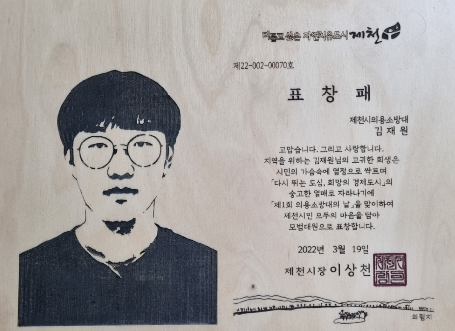 시상식은 코로나 19로 인해 순연되다가 4월에 제천 소방서에서 진행되었습니다.