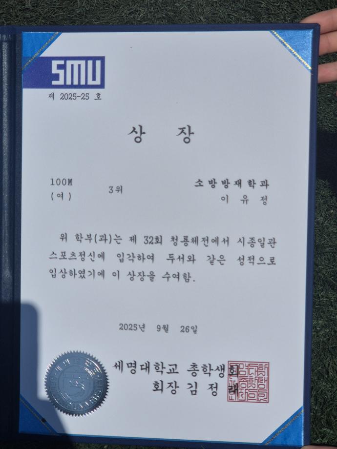 본문 시작 홈으로 커뮤니티 학과소개 교수소개 전공과정 커뮤니티 홈페이지가이드 학과행사 학과공지 채용정보 학사일정 학과행사 동아리 소방방재학과의 자랑 궁금합니다 수험생 Q&A 학과행사 페이스북 트위터 프린트 2025학년도 제32회 청룡체전 소방방재학과 소방방재학과 1842 2025-09-23 2025년 9월 23일 ~9월 25일 제32회 청룡체전 기간동안 여자 피구, 남자 축구, 남자 농구, 혼성 계주, 여자 100m, 남자 100m 참가하였습니다. 선수분들 모두 수고하셨고, 응원해주신 학우분들 감사드립니다! 목록 이전KICT 화재안전연구소 견학 다음 2026학년도 세명대학교 소방방재학과 꿈 설계학기 담당부서 : 소방방재학과 담당자 : - 연락처 : 043-649-1787 최종수정일 : 2024-10-26 만족도조사 만족도 조사 이 페이지에서 제공하는 정보에 대하여 만족하시나요? 매우만족 만족 보통 불만족 매우불만족