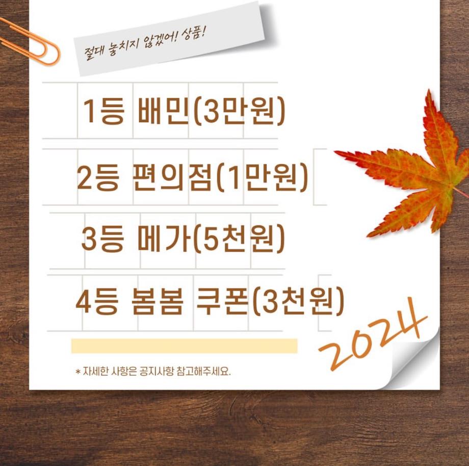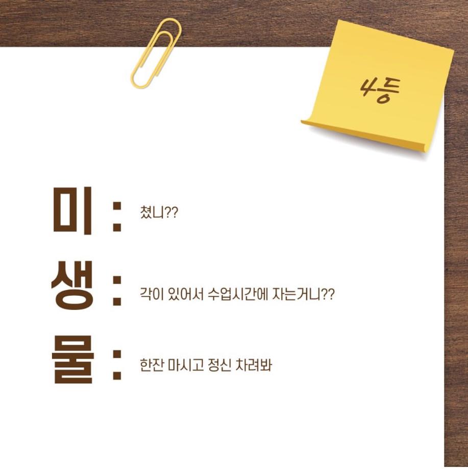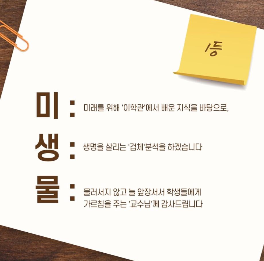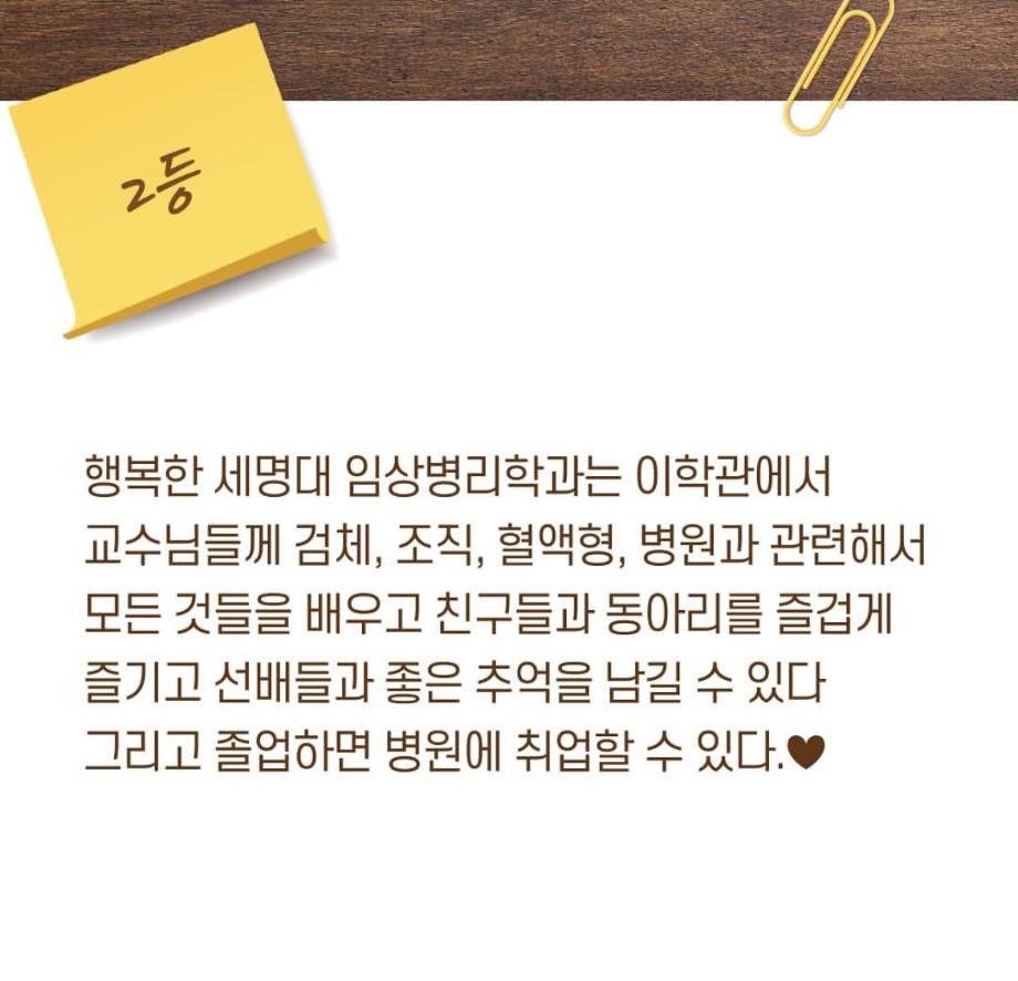 본문 시작 9월 학과 문장만들기 임상병리학과 2298 2024-10-03 9월 학과 개설된 달 기념 3행시, 문장 만들기 이벤트 우수작 총 15개를 선정하였지만 사진 제한이 있어 다 올리지는 못하였습니다 ! 상품은 다음 주 중으로 증정해 드릴 예정입니다 :) 이번 이벤트에 많은 관심을 가져주셔서 감사합니다. 다음에도 좋은 이벤트가 기다리고 있으니 기대해주시길 바랍니다 ! 목록 이전헌혈 버스 다음 중간고사 학용품 이벤트 담당부서 : 임상병리학과 담당자 : - 연락처 : 043-649-1537 최종수정일 : 2024-10-26 만족도조사 만족도 조사 이 페이지에서 제공하는 정보에 대하여 만족하시나요? 매우만족 만족 보통 불만족 매우불만족