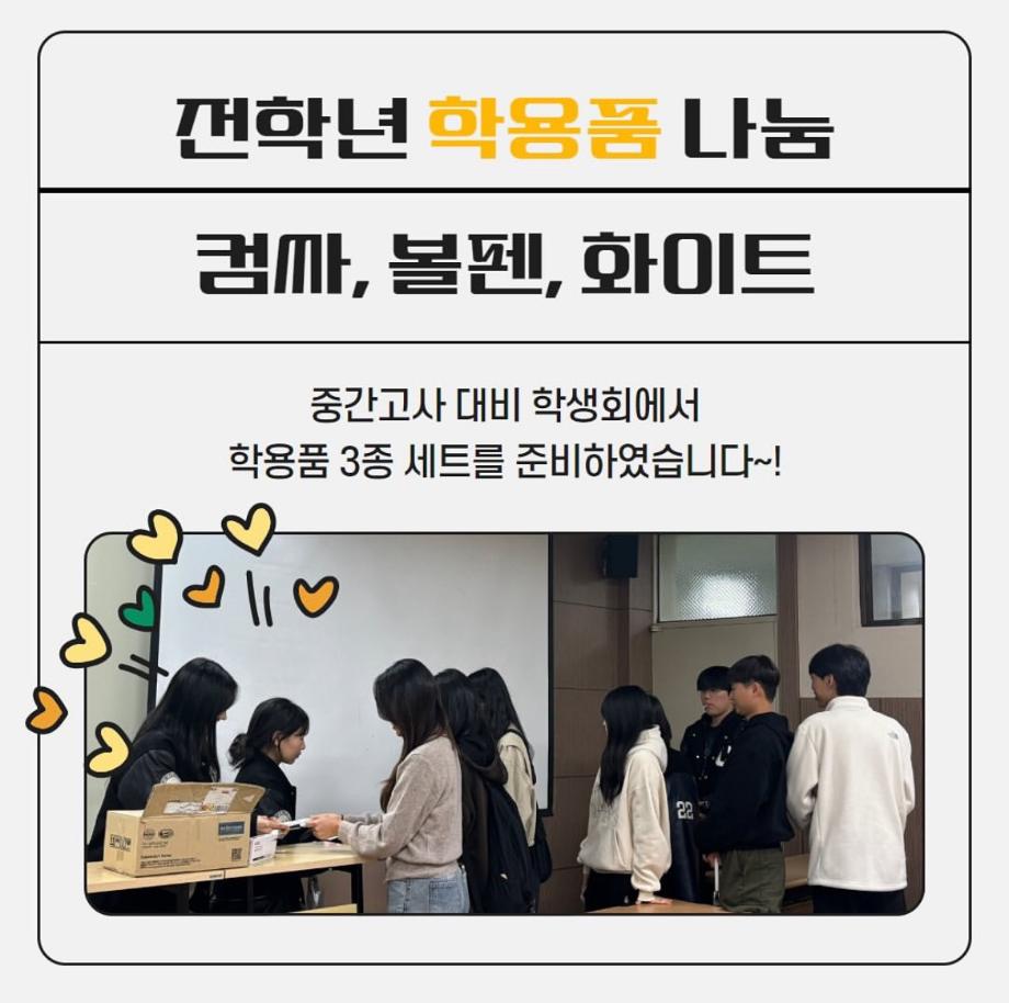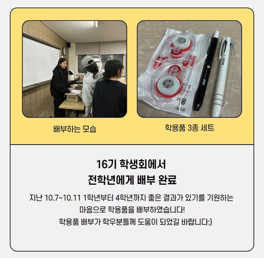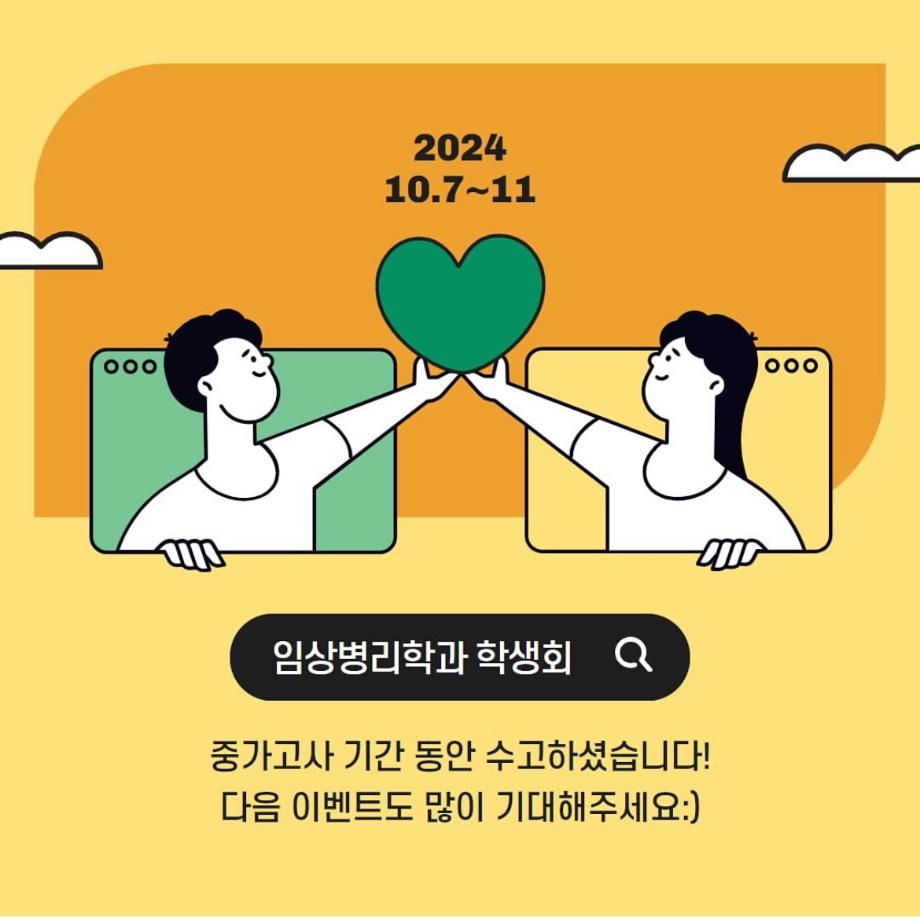 본문 시작 중간고사 학용품 이벤트 임상병리학과 3109 2024-10-22 지난 10/7~10/11 전 학년 좋은 결과가 있기를 기원하는 마음으로 학용품 이벤트를 진행하였습니다 ! 이번 학용품 배부가 학우분들께 도움이 되었길 바랍니다 ! 중간고사 기간 동안 수고하셨습니다 ! 다음 이벤트도 많이 기대해 주세요 :) 목록 이전9월 학과 문장만들기 다음 할로윈 사탕 이벤트 담당부서 : 임상병리학과 담당자 : - 연락처 : 043-649-1537 최종수정일 : 2024-10-26 만족도조사 만족도 조사 이 페이지에서 제공하는 정보에 대하여 만족하시나요? 매우만족 만족 보통 불만족 매우불만족