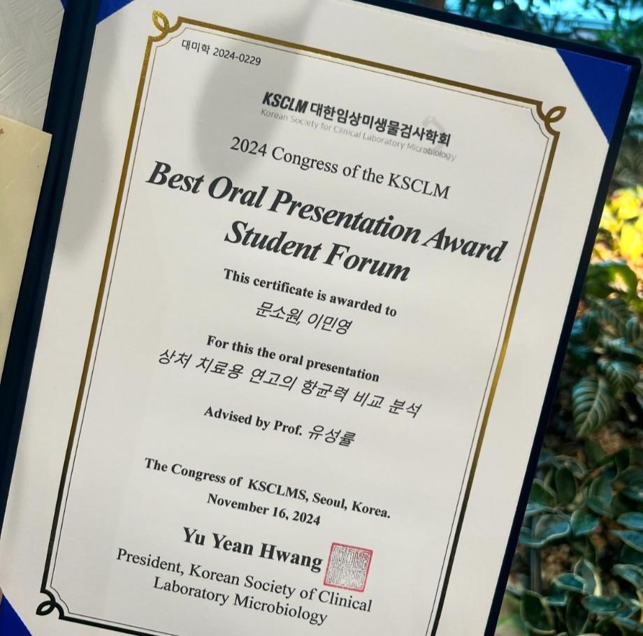 본문 시작 KSCLM 대한미생물검사학회 최우수상 임상병리학과 3217 2024-11-21 세명대학교 임상병리학과 이민영,문소원 학생이 지난 11월 16일 KSCLM 대한미생물검사학괴에서 '상처 치료제의 항균력 비교 분석' 이라는 주제로 발표하여 최우수상을 수상하였습니다. 앞으로도 많은 학생이 다양한 행사와 연구에 참여하여 많은 성과를 얻어갔으면 합니다! 다시 한번 수상을 진심으로 축하합니다 !! 목록 다음 헌혈 버스 오는 날 이전졸업 선물 이벤트 담당부서 : 임상병리학과 담당자 : - 연락처 : 043-649-1537 최종수정일 : 2024-10-26 만족도조사 만족도 조사 이 페이지에서 제공하는 정보에 대하여 만족하시나요? 매우만족 만족 보통 불만족 매우불만족