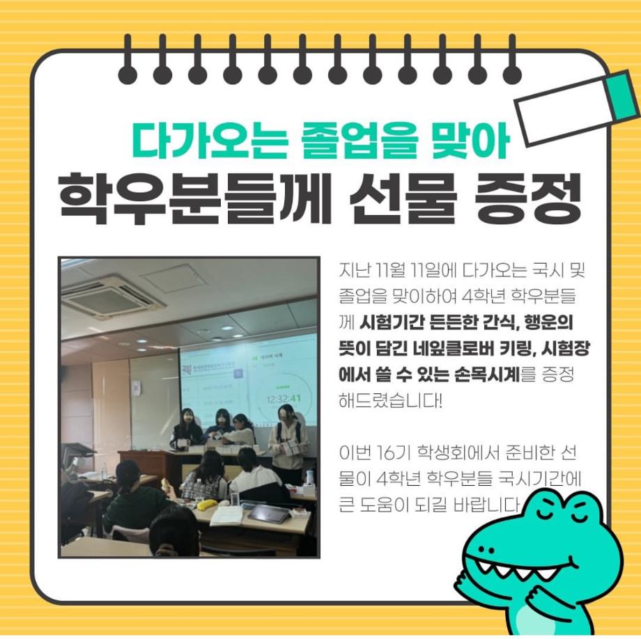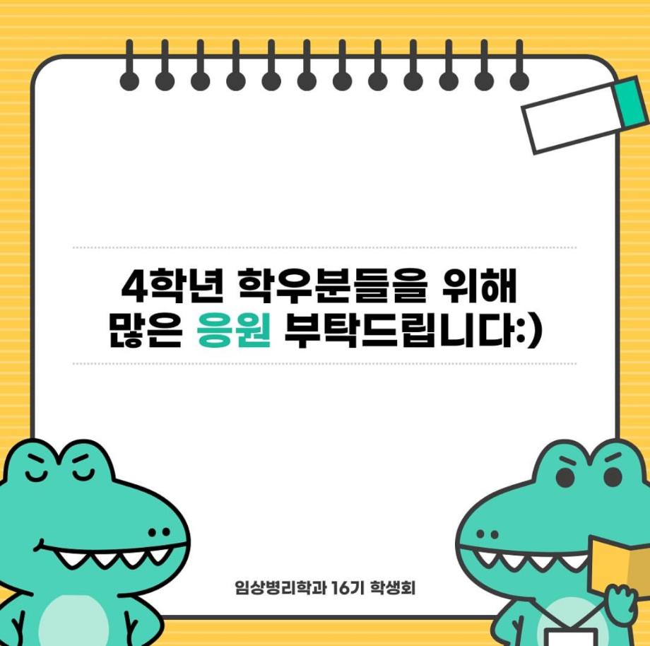 본문 시작 졸업 선물 이벤트 임상병리학과 3403 2024-11-11 11월 11일 국시 및 졸업을 앞둔 4학년 학우분들을 위해 16기 학생회에서 졸업 선물을 준바했습니다! 이번 이벤트가 학우분들께 도움이 되길 바랍니다! 목록 다음 KSCLM 대한미생물검사학회 최우수상 다음 2025년도 졸업식 축하 영상 담당부서 : 임상병리학과 담당자 : - 연락처 : 043-649-1537 최종수정일 : 2024-10-26 만족도조사 만족도 조사 이 페이지에서 제공하는 정보에 대하여 만족하시나요? 매우만족 만족 보통 불만족 매우불만족