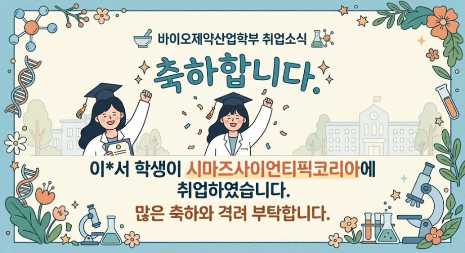 본문 시작 홈으로 학부자료실 학부소개 교육과정 학부공지게시판 학부자료실 홈페이지가이드 학부행사 및 사진게시판 학부행사 및 사진게시판 학생회 소개 학부행사 및 사진게시판 페이스북 트위터 프린트 축하합니다. 이*서 학생이 시마즈사이언티픽코리아에 취업하였습니다. 바이오제약산업학부 38 2026-04-27 축하합니다. 이*서 학생이 시마즈사이언티픽코리아에 취업하였습니다. 목록 이전축하합니다. 추*경 학생이 라이프 슈티컬에 취업하였습니다. 다음 2026 자기설계 해외배낭연수 설명회 시행 안내 담당부서 : 바이오제약산업학부 담당자 : - 연락처 : 043-649-1729 최종수정일 : 2024-10-26 만족도조사 만족도 조사 이 페이지에서 제공하는 정보에 대하여 만족하시나요? 매우만족 만족 보통 불만족 매우불만족