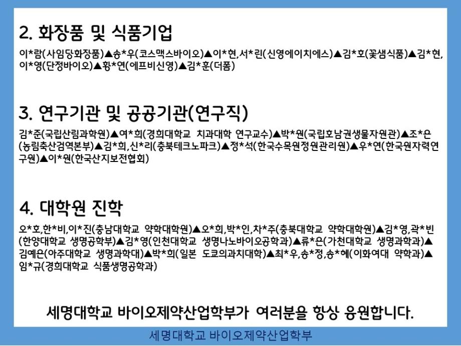 본문 시작 홈으로 학부자료실 학부소개 교육과정 학부공지게시판 학부자료실 홈페이지가이드 학부행사 및 사진게시판 학부행사 및 사진게시판 학생회 소개 학부행사 및 사진게시판 페이스북 트위터 프린트 바이오제약산업학부 취업자/진학자 현황 (2024년 9월) 바이오제약산업학부 1999 2024-09-06 바이오제약산업학부 취업자/진학자 현황 (2024년 9월) 목록 이전충북 대학생 일자리 박람회 참여 다음 "한의학과 정밀의료의 융합" 담당부서 : 바이오제약산업학부 담당자 : - 연락처 : 043-649-1729 최종수정일 : 2024-10-26 만족도조사 만족도 조사 이 페이지에서 제공하는 정보에 대하여 만족하시나요? 매우만족 만족 보통 불만족 매우불만족
