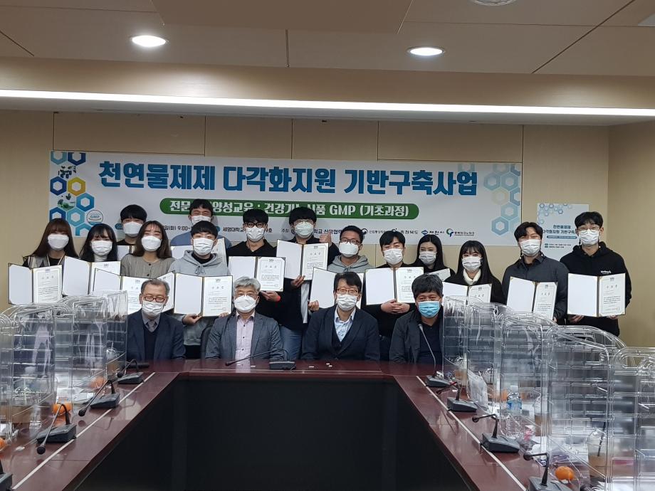 본문 시작 홈으로 학부자료실 학부소개 교육과정 학부공지게시판 학부자료실 홈페이지가이드 학부행사 및 사진게시판 학부행사 및 사진게시판 학생회 소개 학부행사 및 사진게시판 페이스북 트위터 프린트 천연물제제 다각화지원 기반 구축사업 바이오제약산업학부 7915 2020-11-17 천연물제제 다각화지원 기반 구축사업 <과정명 : 건강기능식품 GMP교육 기초과정> - 일시 : 2020년 11월 17일(화) 9:00~18:00 - 장소 : 세명대학교 학술관 109호 - 주최 : 세명대학교 산학협력단 - 내용 : 바이오제약산업학부 학생들은 11월 17일 산업통상자원부의 천연물제제 다각화지원 기반구축사업의 일환으로 세명대학교 산학협력단이 시행한 교육과정의 전 과정을 이수하여 수료증을 수여받았습니다. 축하합니다. 목록 이전2020 정기재물조사 모범상 수상 다음 바이오제약산업학부 임병옥교수, 공로상 표창 수상 담당부서 : 바이오제약산업학부 담당자 : - 연락처 : 043-649-1729 최종수정일 : 2024-10-26 만족도조사 만족도 조사 이 페이지에서 제공하는 정보에 대하여 만족하시나요? 매우만족 만족 보통 불만족 매우불만족
