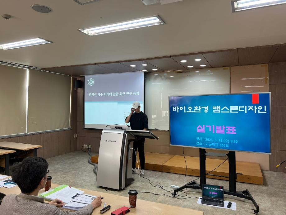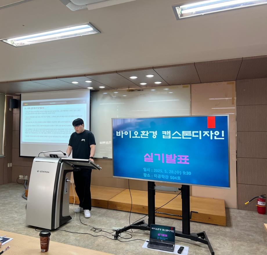 본문 시작 홈으로 커뮤니티 학과소개 교수소개 학과과정 커뮤니티 홈페이지가이드 학과활동 및 행사 학과공지 채용정보 학과활동 및 행사 전공자료실 동아리 학과활동 및 행사 페이스북 트위터 프린트 2025학년도 바이오환경공학과(환경에너지학과) 캡스톤디자인 최종발표회 개최 환경에너지학과 1412 2025-05-28 4학년 졸업논문과 연계한 '바이오환경캡스톤디자인' 최종 발표회가 개최되었습니다. 1. 일시 : 2025.05.28.(수). 9:30 2. 장소 : 이공학관 504호 학과 지도교수님의 지도로 총 2개팀의 발표와 질의응답이 있었습니다. 발표의 주제는 다음과 같습니다. 1) 방사성 폐수 처리에 관한 최근 연구 동향 (지도교수 : 최석순) 2) 국내 환경분야의 딥러닝 기법 적용 사례조사 (지도교수 : 윤석표) 한 학기 동안 졸업논문 발표 준비한 4학년 학생들과 지도교수님 모두 수고 많으셨습니다. 목록 이전환경에너지학과/재난안전학과 단체 봉사 실시 다음 바이오환경실무체험 학술특강 1차 실시 담당부서 : 환경에너지학과 담당자 : - 연락처 : 043-649-1337 최종수정일 : 2024-10-26 만족도조사 만족도 조사 이 페이지에서 제공하는 정보에 대하여 만족하시나요? 매우만족 만족 보통 불만족 매우불만족