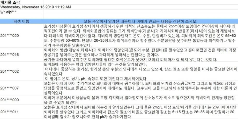 이공계 특성상 학생들과의 쌍방향 소통에 어려움이 있어 항상 고민이 많으셨던 바이오환경공학과 윤석표 교수님께서 대안으로 세미나에서 소개받은 여러 가지 앱 가운데 “Socrative”를 전공수업(바이오환경공학과 2학년 “폐기물 소각”수업, 담당교수:윤석표)에 적용하여 학생들과 쌍방향 소통을 진행하셨습니다. 그 결과는 바이오환경공학과 블로그에서 확인하실 수 있습니다 :)