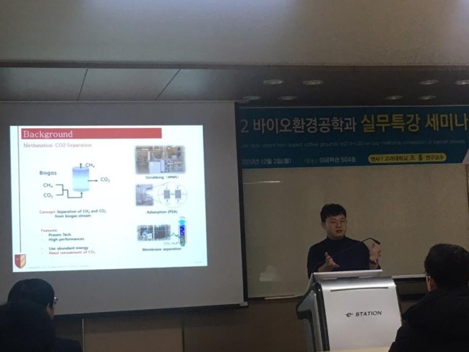 2019.12.02 바이오환경실무체험의 일환으로 고려대학교 환경시스템공학과 조흠 연구교수님을 모시고, 'Impact of nanoscale zero valent iron doped coffee grounds (nZVI-CG) on bio-methane conversion of carbon dioxide'라는 제목으로 세미나를 진행하였습니다.