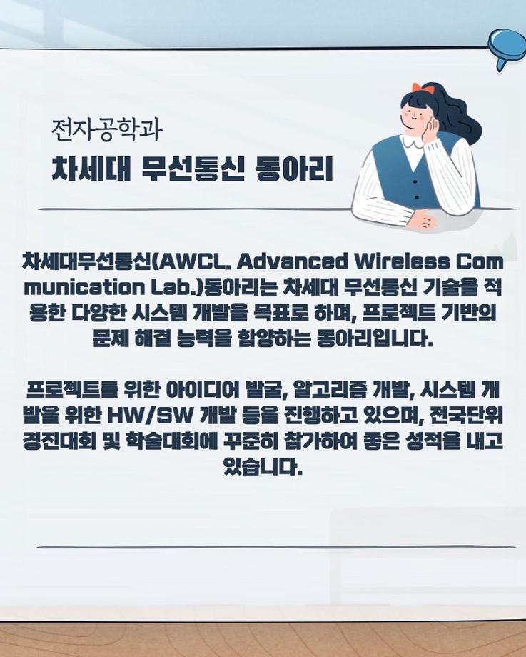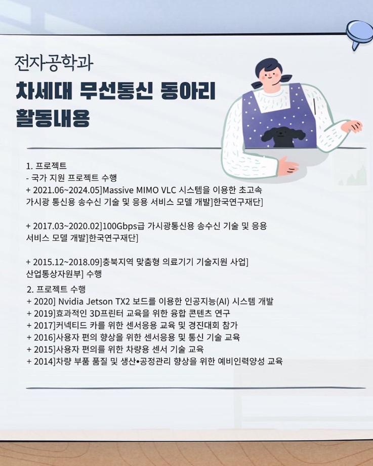 본문 시작 홈으로 커뮤니티 학과소개 교육과정 학과활동 커뮤니티 진로취업 입학상담 홈페이지가이드 포토갤러리 학과공지 포토갤러리 자유게시판 동영상 게시판 포토갤러리 페이스북 트위터 프린트 차세대 무선통신 동아리 홍보 전자공학과 3045 2023-01-17 차세대 무선통신 동아리 홍보입니다. 목록 이전주파수 동아리 홍보 다음 전자공학과 소개 및 학과 시설 소개 담당부서 : 전자공학과 담당자 : - 연락처 : 043-649-1683 최종수정일 : 2024-10-26 만족도조사 만족도 조사 이 페이지에서 제공하는 정보에 대하여 만족하시나요? 매우만족 만족 보통 불만족 매우불만족