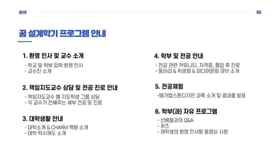 본문 시작 홈으로 학부소식 학부소개 교육과정 학부소식 커뮤니티 홈페이지가이드 학부행사 공지사항 학사일정 학부행사 미문뉴스 미문한컷 포토갤러리 학부행사 페이스북 트위터 프린트 [2월의 행사] 꿈설계학기 미디어문화학부 2447 2022-07-01 2022학년도 미디어문화학부 꿈 설계학기가 성황리에 마무리 되었습니다! Q&A와 퀴즈에 열정적으로 참여해주신 22학번 신입생 여러분들, 전공체험 소개를 맡아주신 선배님 감사합니다. 비대면으로 진행되어 아쉬운 부분도 있었지만, 모두에게 유익하고 즐거운 시간이 되었기를 바랍니다. 건강한 모습으로 학교에서 만날 수 있길 기대하고 있겠습니다! 신입생 여러분들의 학교 및 학부 생활을 응원합니다. 목록 이전[12월의 행사]미디어문화학부 국제인증 ACP일러스트 자격증 특강 프로그램 운영 다음 [3월의 행사] 신입생 환영회 담당부서 : 미디어문화학부 담당자 : - 연락처 : 043-649-1760 최종수정일 : 2024-10-26 만족도조사 만족도 조사 이 페이지에서 제공하는 정보에 대하여 만족하시나요? 매우만족 만족 보통 불만족 매우불만족