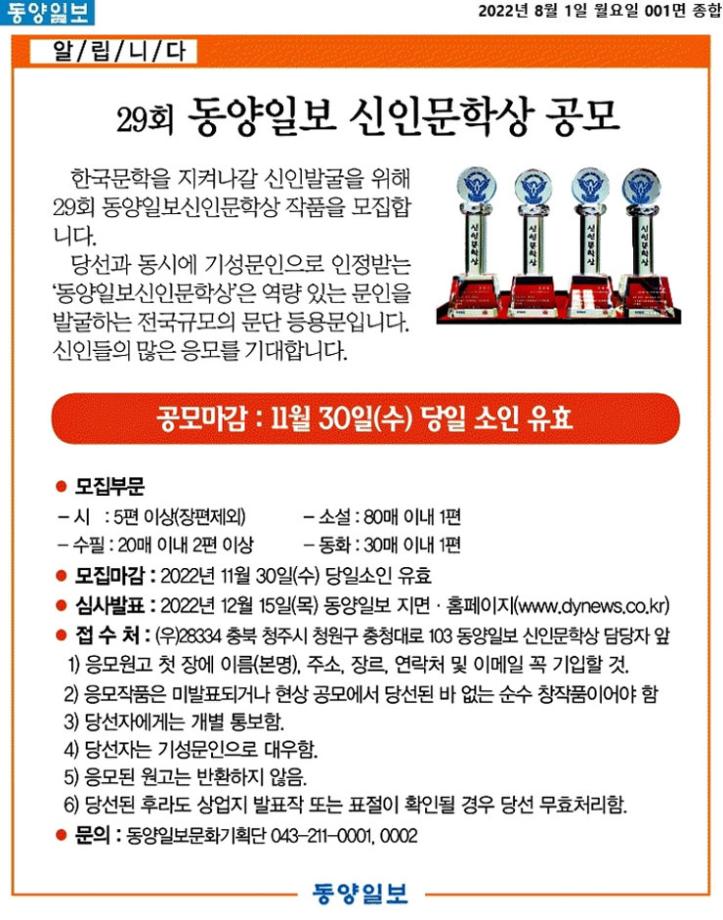 - 29회 동양일보 신인문학상 공모: (~ 11/30) _ http://www.dynews.co