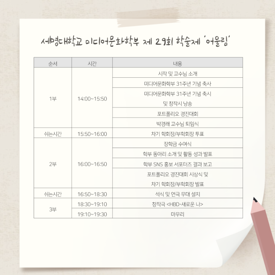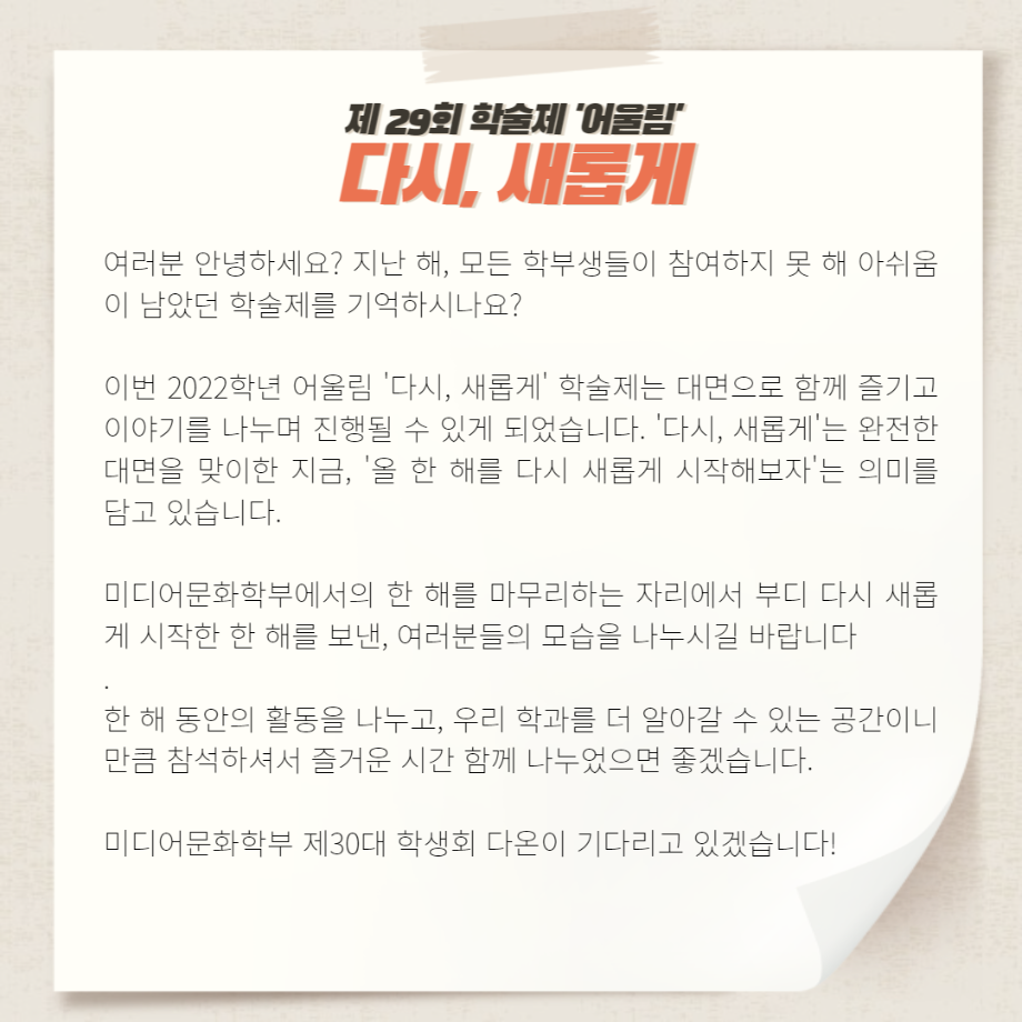 본문 시작 홈으로 학부소식 학부소개 교육과정 학부소식 커뮤니티 홈페이지가이드 학부행사 공지사항 학사일정 학부행사 미문뉴스 미문한컷 포토갤러리 학부행사 페이스북 트위터 프린트 미디어문화학부 학술제 어울림 '다시, 새롭게' 미디어문화학부 3506 2022-11-16 11월 23일 (수) 14:00 학술관 112호에서 미디어문화학부의 가장 큰 행사인 학술제 어울림 '다시, 새롭게'를 진행합니다. 포트폴리오 경진대회, 창작시 낭송, 창작극 그리고 차기 학회장/부학회장 발표도 있을 예정입니다! 🫶 오랜만에 모든 학우분들과 함께하는 대면 행사이기에 많은 참여 및 관심 부탁드립니다! 목록 이전교내외 공모전 안내 다음 미디어문화학부 학술제 어울림 '다시, 새롭게' 담당부서 : 미디어문화학부 담당자 : - 연락처 : 043-649-1760 최종수정일 : 2024-10-26 만족도조사 만족도 조사 이 페이지에서 제공하는 정보에 대하여 만족하시나요? 매우만족 만족 보통 불만족 매우불만족