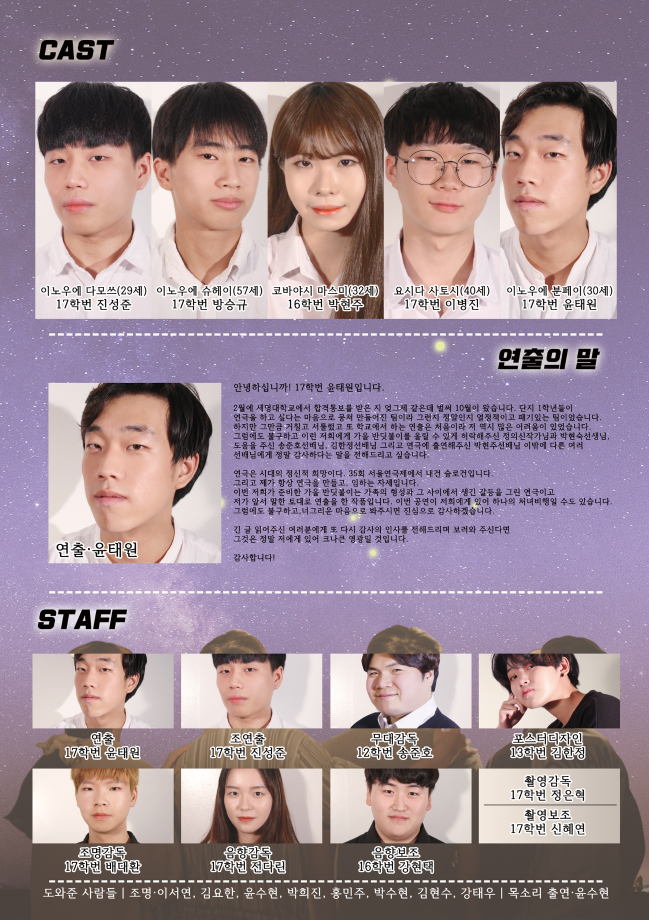 본문 시작 홈으로 커뮤니티 학과소개 교수소개 학과과정 커뮤니티 작품DB 서울대학로 민송아트홀 홈페이지가이드 사진자료실 학과공지 전공자료실 사진자료실 사진자료실 페이스북 트위터 프린트 [공연영상학과] 1학년 하계 워크숍 "가을 반딧불이" 공연영상학과 10559 2017-12-11 - 공연일시: 2017년 10월 11일 오후 7시 태양아트홀 - 정의신 作 - 지도교수: 이정하 - 학생연출: 윤태원 - 배우: 박현주, 진성준, 이병진, 방승규, 윤태원 - 포스터디자인,촬영: 김한정 - 음향디자인,OP: 강현택 - 조명디자인,OP: 전다린, 배대환 - 스텝: 송준호, 정은혁, 신혜연 목록 이전[공연영상학과] 2학년 하계 워크숍 '베니스의 상인' 다음 세명대학교 공연영상학과 제 10회 졸업공연 '트루 웨스트' 담당부서 : 공연영상학과 담당자 : - 연락처 : 043-649-1429 최종수정일 : 2024-10-26 만족도조사 만족도 조사 이 페이지에서 제공하는 정보에 대하여 만족하시나요? 매우만족 만족 보통 불만족 매우불만족