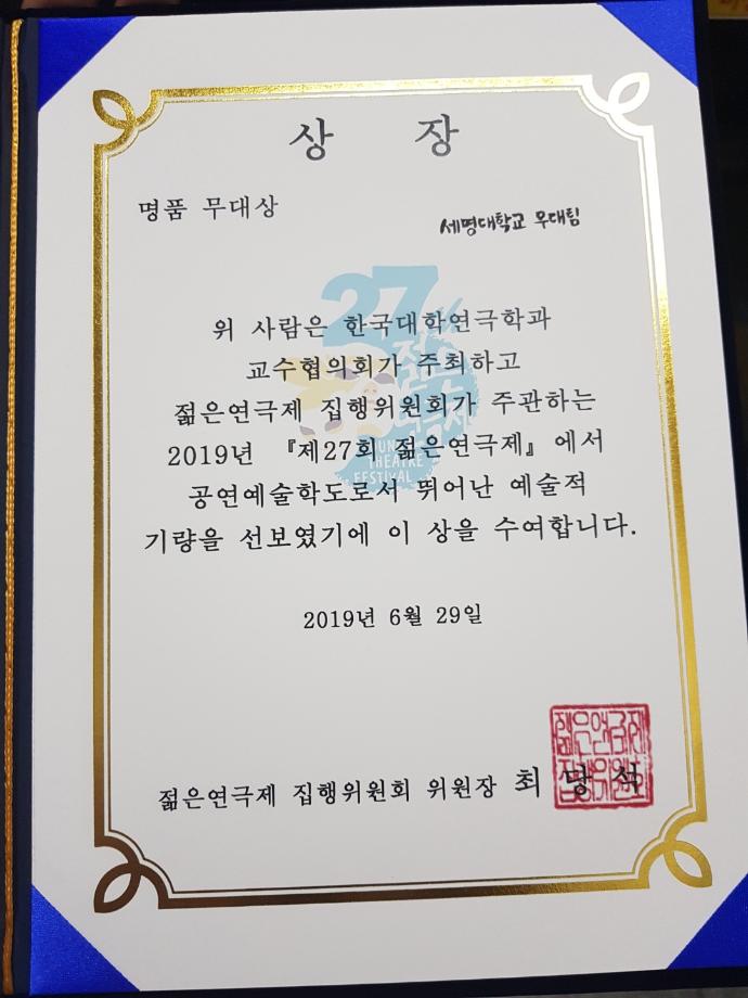 본문 시작 홈으로 커뮤니티 학과소개 교수소개 학과과정 커뮤니티 작품DB 서울대학로 민송아트홀 홈페이지가이드 사진자료실 학과공지 전공자료실 사진자료실 사진자료실 페이스북 트위터 프린트 [공연영상학과] 제 27회 젊은연극제 무대상 수상 공연영상학과 5946 2019-06-29 2019년 6월 29일, 제 27회 젊은연극제 폐막식과 시상식이 서울 대학로에서 진행되었습니다. 폐막식과 시상식에는 행사를 위해 힘써주신 관계자분들과 각 학교에 대표수상자들이 자리를 빛내주었는데요, 이날, 작품의 무대감독이었던 오창준 학생이 대표수상자로써 명품무대상을 수상하는 영광을 얻게 되었습니다. 젊은연극제 참가를 위해 애써주신 담당교수님들과, 학과생 여러분들. 모두들 고생많으셨고, 수상을 진심으로 축하드립니다! 목록 이전[공연영상학과] 제 27회 젊은연극제 참가작 " 니 부모 얼굴이 보고싶다 " 다음 [공연영상학과] JTBC 드라마 '우아한 친구들' 촬영지 제공 담당부서 : 공연영상학과 담당자 : - 연락처 : 043-649-1429 최종수정일 : 2024-10-26 만족도조사 만족도 조사 이 페이지에서 제공하는 정보에 대하여 만족하시나요? 매우만족 만족 보통 불만족 매우불만족
