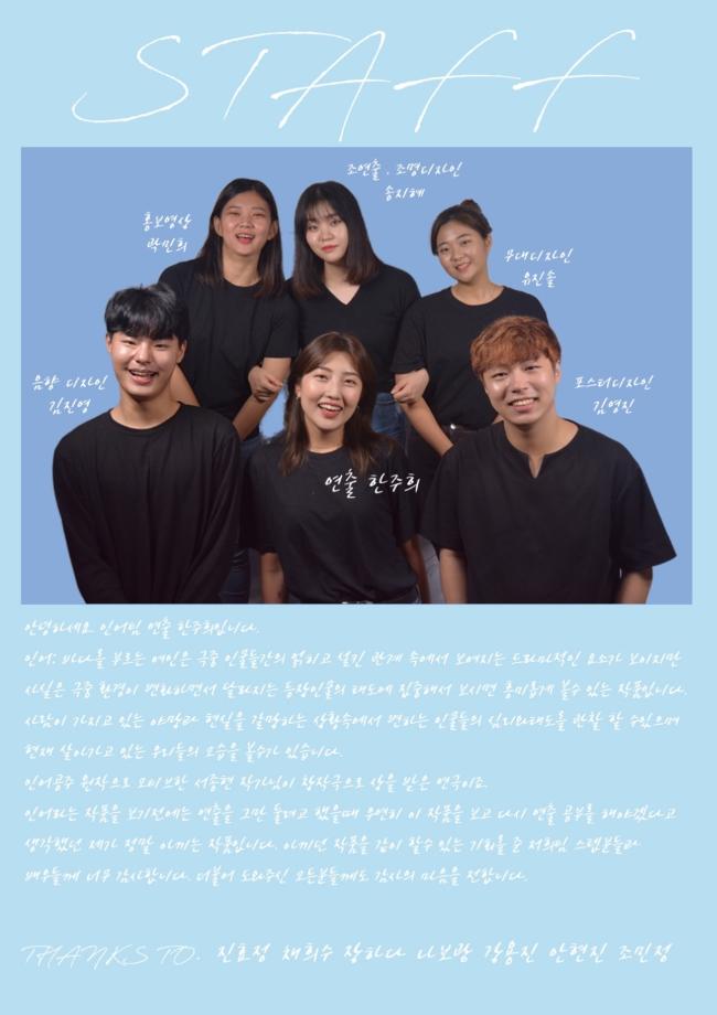 본문 시작 홈으로 커뮤니티 학과소개 교수소개 학과과정 커뮤니티 작품DB 서울대학로 민송아트홀 홈페이지가이드 사진자료실 학과공지 전공자료실 사진자료실 사진자료실 페이스북 트위터 프린트 [공연영상학과] 하계프로젝트 " 인어;바다를 부르는 여인 " 공연영상학과 5777 2019-10-15 연출 : 한주희 조연출 : 송지혜 배우 : 원성준, 임현자, 김수영, 이종화 무대디자인 : 유진솔 조명디자인: 송지혜 음향디자인: 김진영 포스터디자인: 김영진 홍보영상 : 곽민희 목록 이전[공연영상학과] 영상장비교육 다음 [공연영상학과] 2019학년도 졸업영화제 '어쩌다 졸업,' 담당부서 : 공연영상학과 담당자 : - 연락처 : 043-649-1429 최종수정일 : 2024-10-26 만족도조사 만족도 조사 이 페이지에서 제공하는 정보에 대하여 만족하시나요? 매우만족 만족 보통 불만족 매우불만족