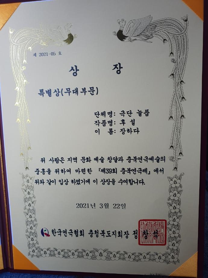 본문 시작 홈으로 커뮤니티 학과소개 교수소개 학과과정 커뮤니티 작품DB 서울대학로 민송아트홀 홈페이지가이드 사진자료실 학과공지 전공자료실 사진자료실 사진자료실 페이스북 트위터 프린트 ★ 졸업생 무대디자이너 '장하다' 특별상 수상 ★ 공연영상학과 4550 2021-05-07 제 39회 충북연극제에서 극단 늘품의 '후설' 무대를 총괄한 세명대학교 공연영상학과 졸업생 장하다 무대디자이너가 특별상을 수상하였습니다. 진심으로 축하드립니다! ↓↓↓↓↓ 관련 기사↓↓↓↓↓ 충북연극제 대상에 극단 늘품 ‘후설’ - http://naver.me/FxLMY4cZ 목록 이전[공연영상학과] 2021 동계프로젝트 '오아시스 세탁소 습격사건' 다음 2021학년도 2학기 과체전 담당부서 : 공연영상학과 담당자 : - 연락처 : 043-649-1429 최종수정일 : 2024-10-26 만족도조사 만족도 조사 이 페이지에서 제공하는 정보에 대하여 만족하시나요? 매우만족 만족 보통 불만족 매우불만족