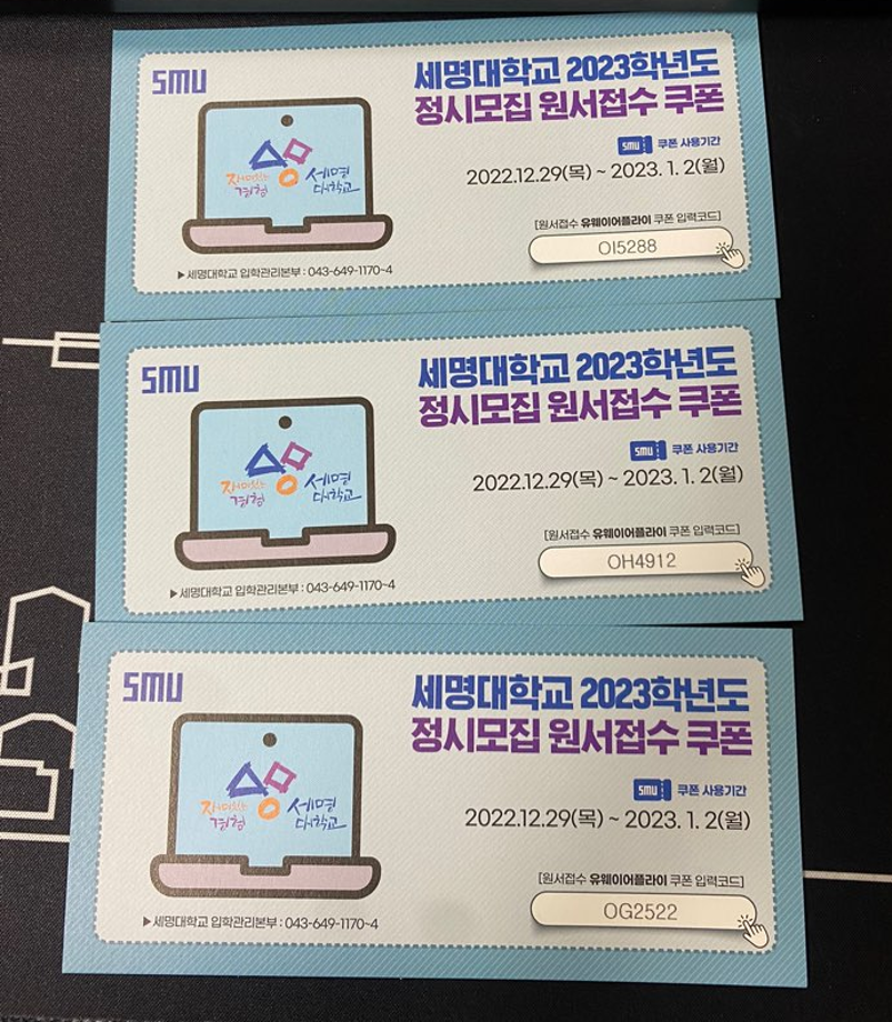 학생들의 부담을 줄어주고자 정시모집 원서접수쿠폰을 준비했으니 부담없이 지원해주시면 됩니다.