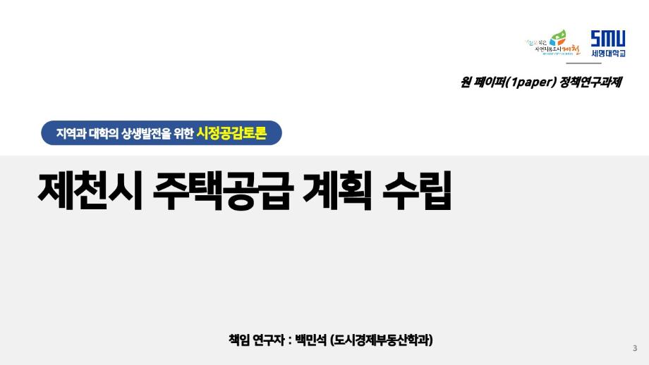 2021년 8월 25일 정부예산 확보 및 정책사업 발굴을 목표로 지역과 대학의 상생발전 연구협력체계 구축을 위한 '제천시 원 페이퍼(1paper) 정책연구과제 공모를 통한 백민석교수님의 '제천시 주택공급 계획 수립'이 선정되었습니다.