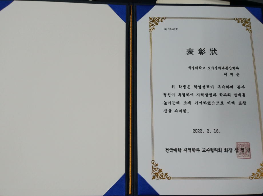 본문 시작 홈으로 학과 소식 학과소개 취업 및 진로 언론 및 보도 학과 소식 대학원 홈페이지가이드 행사사진게시판 행사사진게시판 공지사항 일반자료실 강의자료실 부동산학보 동아리 행사사진게시판 페이스북 트위터 프린트 2021학년도 전기 졸업자 표창 수상 도시경제부동산학과 2482 2022-02-09 2021학년도 전기 졸업자 표창 수상 안내입니다. 한국지적정보학회 학회장상 : 최유정 한국국토정보공사 사장표창 : 이현지 전국대학 지적학과 교수협의회 우수학생표창 : 이지은 부동산학과 수상자 여러분 모두 진심으로 축하드립니다. 각 수상자는 우편으로 표창장을 발송 할 예정입니다. 작성자 : 디지털홍보특별채용 조교 목록 이전2021학년도 전기 졸업자 표창 수상 다음 2021학년도 전기 졸업식 담당부서 : 부동산지적학과 담당자 : - 연락처 : 043-649-1784 최종수정일 : 2024-10-26 만족도조사 만족도 조사 이 페이지에서 제공하는 정보에 대하여 만족하시나요? 매우만족 만족 보통 불만족 매우불만족