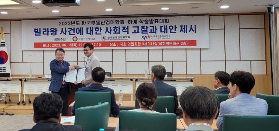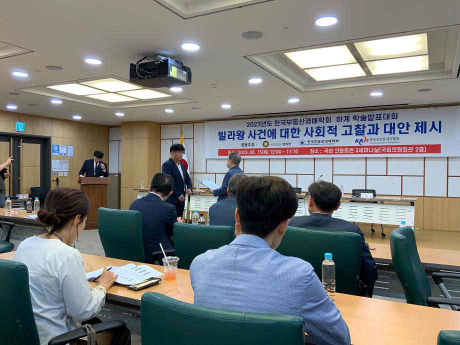한국부동산경매학회(회장 김상진: 세명대학교 부동산지적학과 교수)주관으로 개최된 '빌라왕 사건에 대한 사회적 고찰과 대안 제시' 학술대회가 15일 정오 12시 국회 의원회관 제3세미나실에서 열렸다. 이날 학술대회는 부동산 경매, 법제의 문제를 해결하고 희망찬 미래를 그려가기 위해 마련됐다.