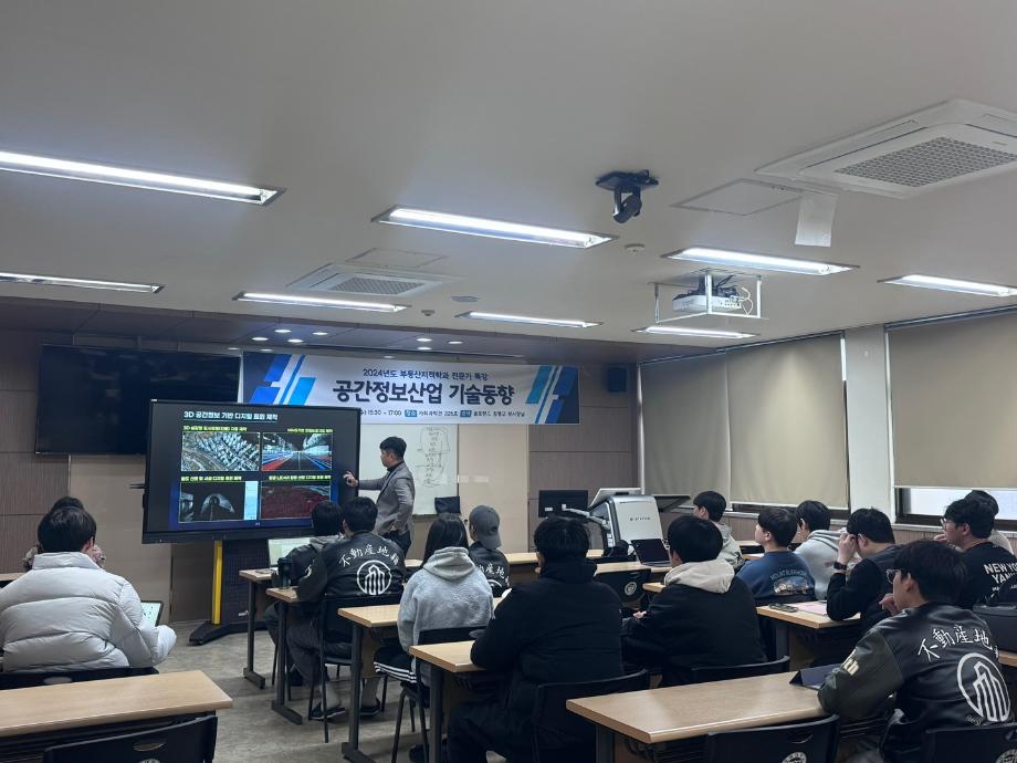 내용 :공간정보산업 회사 ‘올포랜드’에서 진행되는 가상세계를 현상과 동일하게 구축하고, 이를 통해 도시를 모니터링하고 관리하는 스마트 시티의 시작은 디지털 트윈국토 궃룩을 학생들에게 전달하고 실제로 현장에서 활용되고 있는 사례를 보여줌으로 학생들의 진로 선택에 도움이 될 수 있도록 특강을 진행해 주셨습니다.