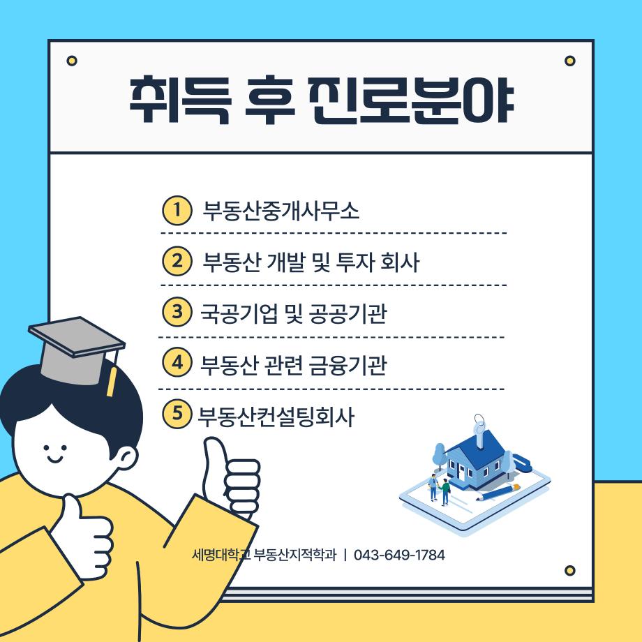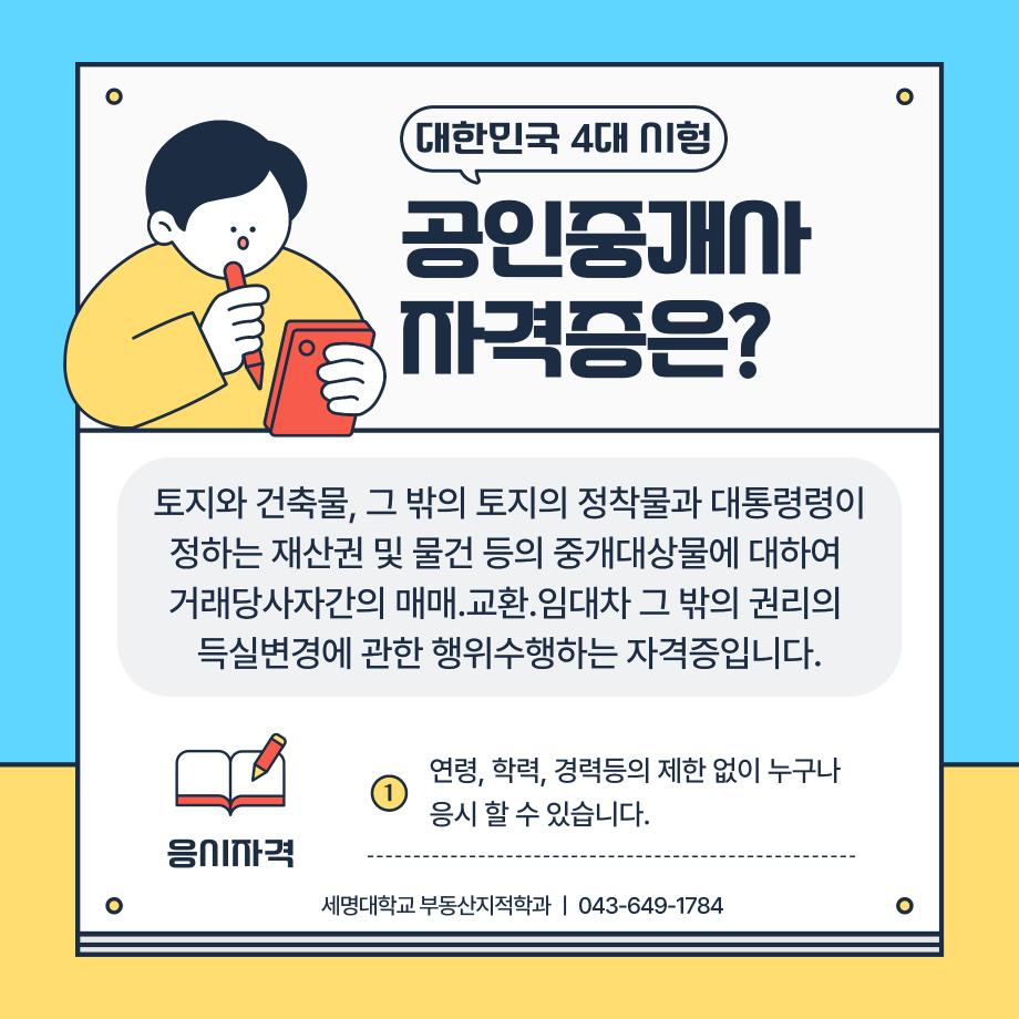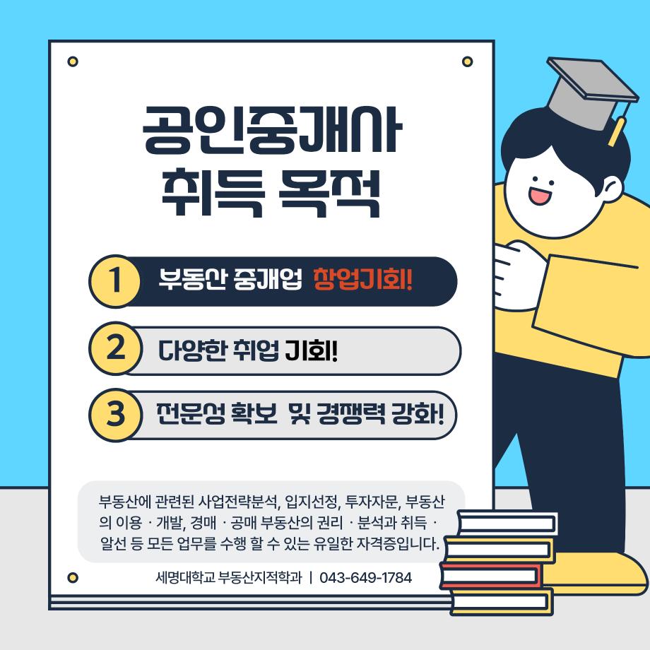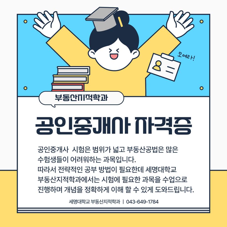 본문 시작 홈으로 학과 소식 학과소개 취업 및 진로 언론 및 보도 학과 소식 대학원 홈페이지가이드 행사사진게시판 행사사진게시판 공지사항 일반자료실 강의자료실 부동산학보 동아리 행사사진게시판 페이스북 트위터 프린트 공인중개사 소개카드 부동산지적학과 2323 2024-11-20 공인중개사 소개 카드입니다. 공인중개사에 관심있는 학생들은 참고하여 주세요. 목록 이전2024학년도 제 35회 부동산지적학과 학술특강 다음 지적기사 소개 카드 담당부서 : 부동산지적학과 담당자 : - 연락처 : 043-649-1784 최종수정일 : 2024-10-26 만족도조사 만족도 조사 이 페이지에서 제공하는 정보에 대하여 만족하시나요? 매우만족 만족 보통 불만족 매우불만족