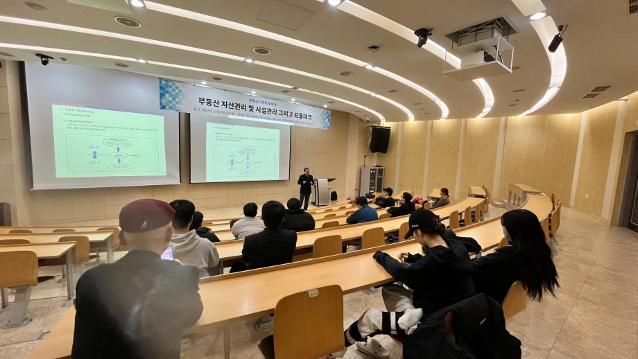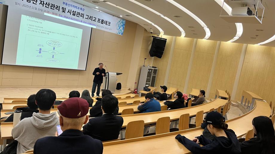 부동산지적학과에서는 (주)디엠이엔지종합건축사사무소 CM관리본부의 김태규 상무님을 모시고 부동산 자산관리(PM)·시설관리(FM) 및 프롭테크 관련 특강을 진행하였습니다. 김태규 상무님께서는 PM·FM의 기원과 개념, 프롭테크의 등장 배경과 산업 트렌드, 그리고 실제 현장에서의 관리 사례까지 자세히 설명해 주셔서 학생들이 산업 구조와 진로 방향을 이해하는 데 큰 도움이 되었습니다.
