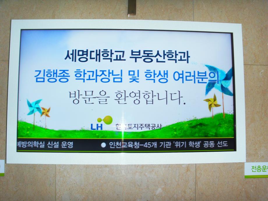 세명대학교 부동산학과(학과장 : 김행종 교수)는 2012년 5월 10일(목) 재학생 150여명과 권기욱, 김상진, 백민석 교수 및 강사 등이 한국토지주택공사 본사(성남시 분당구 정자동)를 방문하였다.