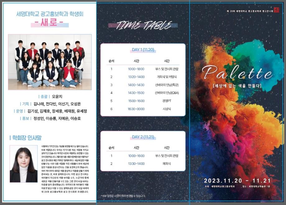 본문 시작 홈으로 특별CC프로그램 매력적인 학과소개 흥미로운 교육과정 특별CC프로그램 We can 취업 따뜻한 커뮤니티 홈페이지가이드 광고전시회 광고전시회 광고영상 제작실습 광고디자인 자격증취득 C&E(도전!경험!) 작품 작품 활동 작품 페이스북 트위터 프린트 [2023년도]제28회광고전시회 광고홍보학과 6185 2023-11-18 2023년도 제 28회 광고홍보학과 광고전시회 개최 팔레트 [세상에 없는 색을 만들다] 목록 이전[2022년도]제27회 광고전시회 다음 [2024년도]제29회 광고전시회
