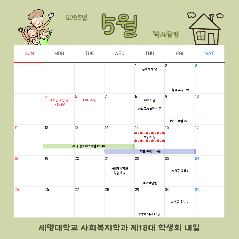 본문 시작 홈으로 커뮤니티 학과소개 교수소개 교육과정 현장실습 및 취업정보 커뮤니티 홈페이지가이드 학사일정 학과공지 학사일정 학생회 동아리 학생 소통 광장 포토갤러리 전공자료실 서식자료실 학사일정 페이스북 트위터 프린트 5월 학사 일정 사회복지학과 787 2025-09-04 2025학년도 5월 학사 일정입니다. 목록 이전4월 학사 일정 다음 6월 학사 일정 담당부서 : 사회복지학과 담당자 : - 연락처 : 043-649-1799 최종수정일 : 2024-10-26 만족도조사 만족도 조사 이 페이지에서 제공하는 정보에 대하여 만족하시나요? 매우만족 만족 보통 불만족 매우불만족