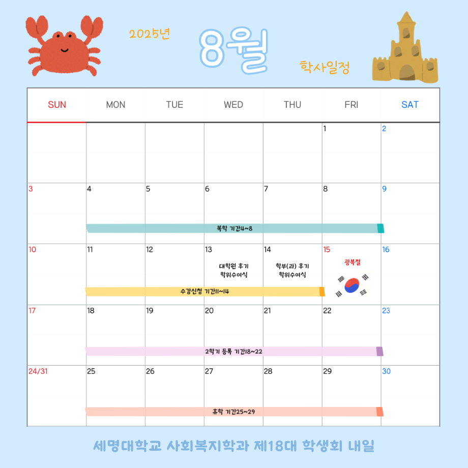 본문 시작 홈으로 커뮤니티 학과소개 교수소개 교육과정 현장실습 및 취업정보 커뮤니티 홈페이지가이드 학사일정 학과공지 학사일정 학생회 동아리 학생 소통 광장 포토갤러리 전공자료실 서식자료실 학사일정 페이스북 트위터 프린트 8월 학사 일정 사회복지학과 896 2025-09-04 2025학년도 8월 학사 일정입니다. 목록 이전6월 학사 일정 다음 9월 학사 일정 담당부서 : 사회복지학과 담당자 : - 연락처 : 043-649-1799 최종수정일 : 2024-10-26 만족도조사 만족도 조사 이 페이지에서 제공하는 정보에 대하여 만족하시나요? 매우만족 만족 보통 불만족 매우불만족