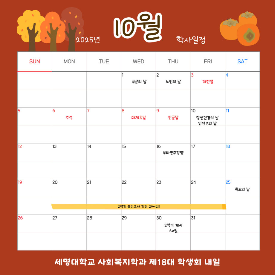 본문 시작 홈으로 커뮤니티 학과소개 교수소개 교육과정 현장실습 및 취업정보 커뮤니티 홈페이지가이드 학사일정 학과공지 학사일정 학생회 동아리 학생 소통 광장 포토갤러리 전공자료실 서식자료실 학사일정 페이스북 트위터 프린트 10월 학사 일정 사회복지학과 760 2025-09-30 2025년도 10월 학사 일정입니다. 목록 이전9월 학사 일정 다음 11월 학사 일정 담당부서 : 사회복지학과 담당자 : - 연락처 : 043-649-1799 최종수정일 : 2024-10-26 만족도조사 만족도 조사 이 페이지에서 제공하는 정보에 대하여 만족하시나요? 매우만족 만족 보통 불만족 매우불만족