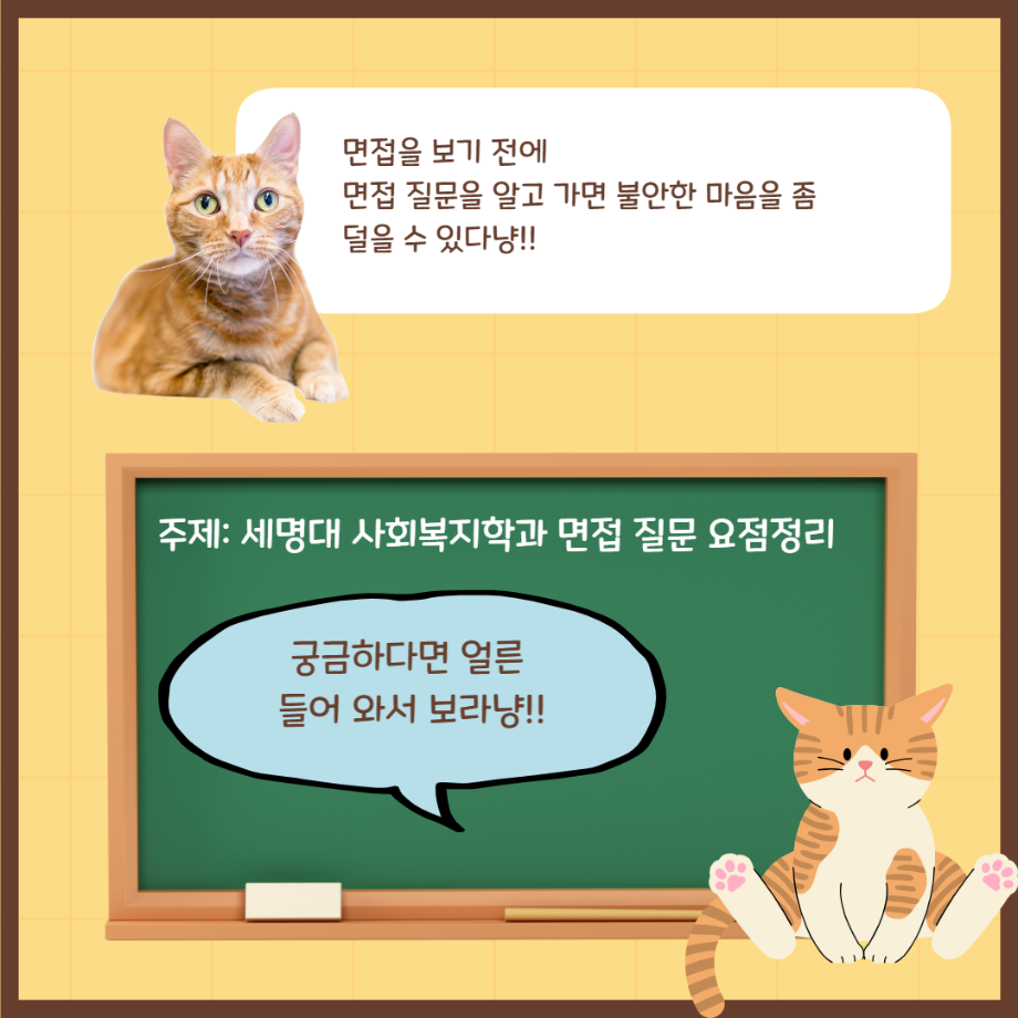 본문 시작 홈으로 커뮤니티 학과소개 교수소개 교육과정 현장실습 및 취업정보 커뮤니티 홈페이지가이드 학생 소통 광장 학과공지 학사일정 학생회 동아리 학생 소통 광장 포토갤러리 전공자료실 서식자료실 학생 소통 광장 페이스북 트위터 프린트 세명대학교 사회복지학과 면접질문이 궁금하다면 나만따라와!! 사회복지학과 2955 2022-09-19 '세명대학교 사회복지학과 면접질문이 궁금하다면 나만따라와!!'편 입니다. 목록 이전교수님께 물어보는 봉사는 무엇일까?_정규형 교수님 편 다음 박소영 교수님 무슨 책을 읽어야 할지 알려 주세요!! 담당부서 : 사회복지학과 담당자 : - 연락처 : 043-649-1799 최종수정일 : 2024-10-26 만족도조사 만족도 조사 이 페이지에서 제공하는 정보에 대하여 만족하시나요? 매우만족 만족 보통 불만족 매우불만족