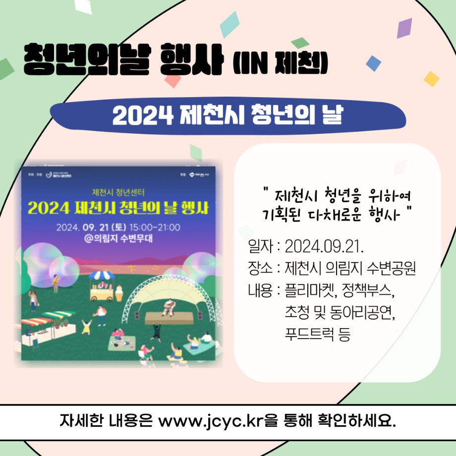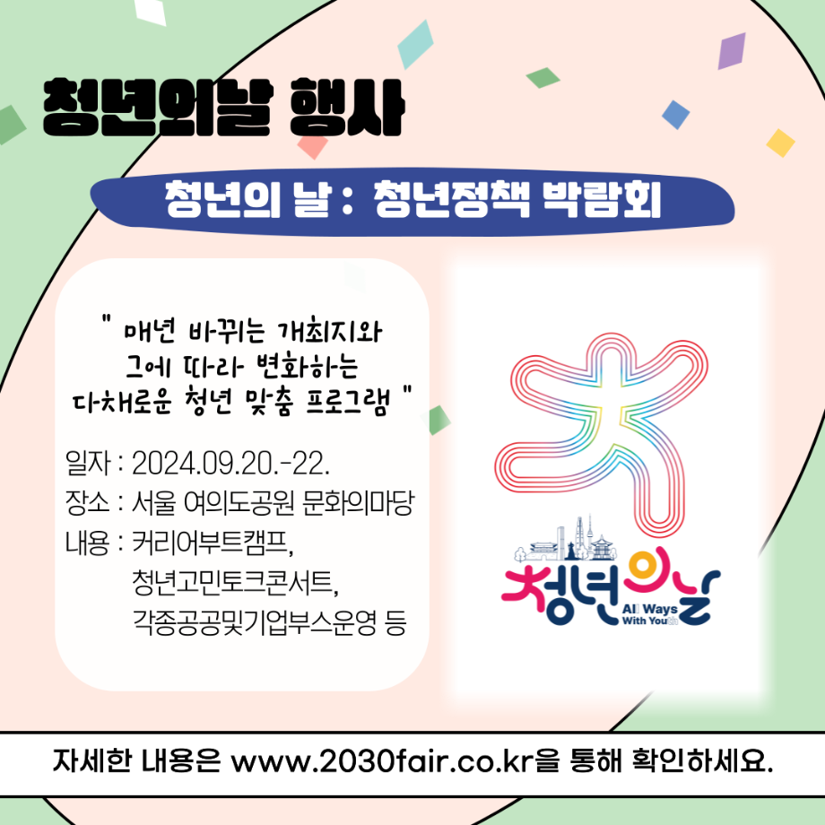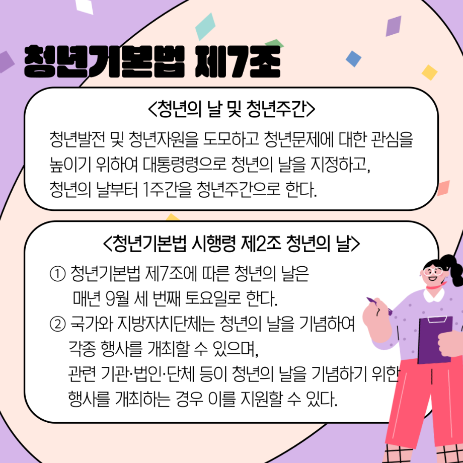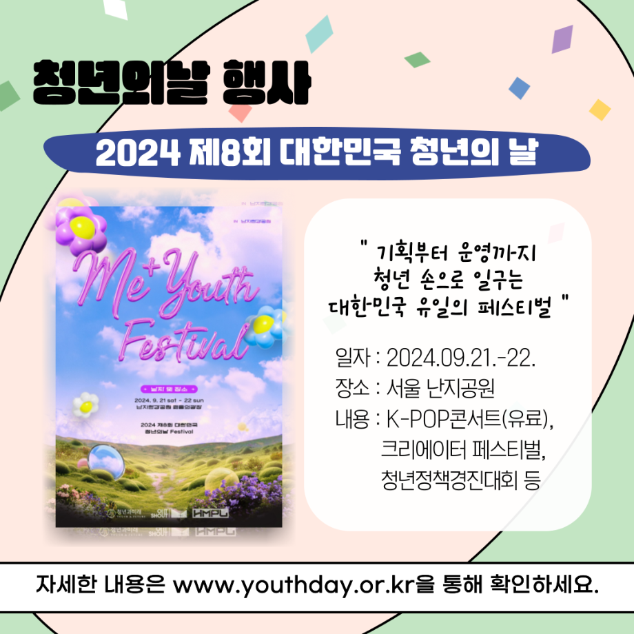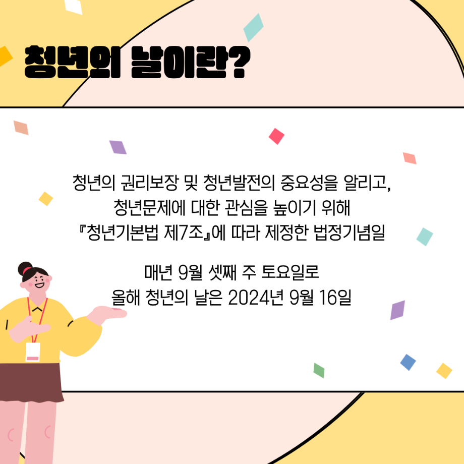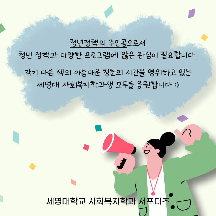 본문 시작 홈으로 커뮤니티 학과소개 교수소개 교육과정 현장실습 및 취업정보 커뮤니티 홈페이지가이드 학생 소통 광장 학과공지 학사일정 학생회 동아리 학생 소통 광장 포토갤러리 전공자료실 서식자료실 학생 소통 광장 페이스북 트위터 프린트 세명대학교 사회복지학과 청년의 날 홍보 사회복지학과 3083 2024-09-21 매년 9월 셋째주 토요일은 『청년기본법 제7조』에 따라 청년의 권리 증진과 문제 해결을 통한 발전을 위해 제정된 '청년의날'입니다 🎉 다양한 청년 정책이 개발되고 발전할 수 있도록 많은 관심이 필요합니다. 목록 이전세명대학교 사회복지학과 아쉬움이 남는다면 Right now 다음 세명대학교 사회복지학과 2025 교환학생 궁금하다면? 담당부서 : 사회복지학과 담당자 : - 연락처 : 043-649-1799 최종수정일 : 2024-10-26 만족도조사 만족도 조사 이 페이지에서 제공하는 정보에 대하여 만족하시나요? 매우만족 만족 보통 불만족 매우불만족