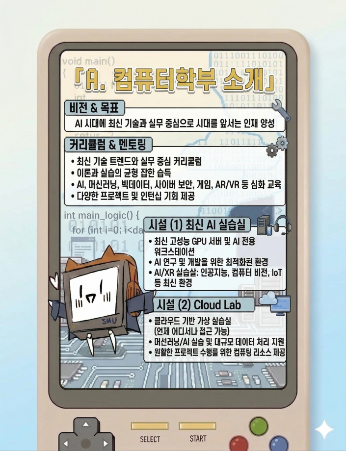 본문 시작 홈으로 학부활동 학부소개 학부활동 교육과정 커뮤니티 학부생활 입학안내 홈페이지가이드 학부갤러리 학부행사 학생회 활동 전공 동아리 학부갤러리 학부갤러리 페이스북 트위터 프린트 2026년 컴퓨터학부 소개 컴퓨터학부 159 2026-03-24 2026학년도 컴퓨터학부를 소개부터 학교 생활에 필요에 대한 가이드까지 안내해드립니다 목록 이전2026학년 신입생 환영회 다음 IT 에서 AI로, "AI융합대학" 으로 바뀌었습니다. 담당부서 : 컴퓨터학부 담당자 : - 연락처 : 043-649-1272 최종수정일 : 2024-10-26 만족도조사 만족도 조사 이 페이지에서 제공하는 정보에 대하여 만족하시나요? 매우만족 만족 보통 불만족 매우불만족