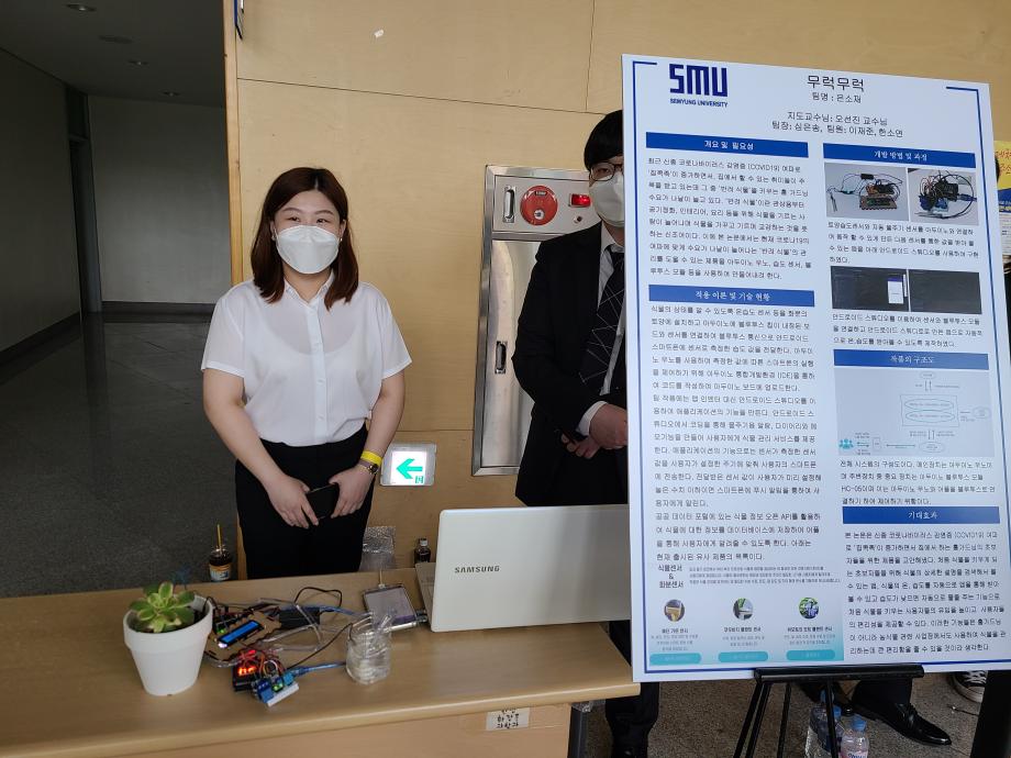 본문 시작 홈으로 SMIT 소식 SMIT 소개 SMIT 교육 SMIT 취업 SMIT 소식 SMIT 입학 홈페이지가이드 경진대회 공지사항 갤러리 경진대회 동아리 경진대회 페이스북 트위터 프린트 2021 캡스톤디자인 장려상 아두이노 습도센서를이용한식물케어 스마트IT학부 4421 2021-09-01 장려상 - 작품명 : 아두이노 습도센서를이용한식물케어 - 지도교수 : 오선진 - 팀원 : 심은송, 이재준, 한소연 코로나19 여파로 ‘집콕족'이 증가하면서 집에서 하는 홈가드닝의 초보자들을 위한 제품을 고안해냈다. 처음 식물을 키우게 되는 초보자들을 위해 센서를 이용하여 앱으로 받아보며 쉬운 식물관리를 도와줄 수 있는 제품을 개발하였다. 목록 이전2020-06-17 온라인 캡스톤디자인 경진대회 다음 2021 캡스톤디자인 장려상 LoRa를 이용한 킥보드 공유서비스 담당부서 : 스마트IT학부 담당자 : - 연락처 : 043-649-1275 최종수정일 : 2024-10-26 만족도조사 만족도 조사 이 페이지에서 제공하는 정보에 대하여 만족하시나요? 매우만족 만족 보통 불만족 매우불만족