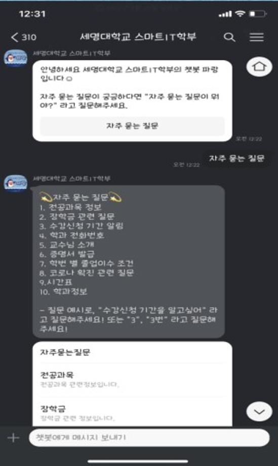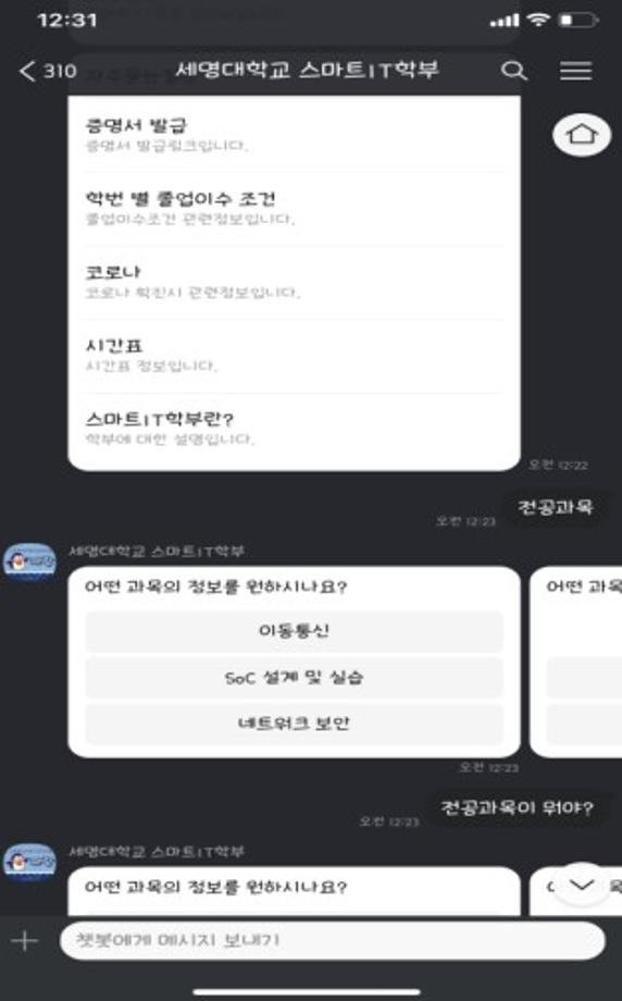 본문 시작 홈으로 SMIT 소식 SMIT 소개 SMIT 교육 SMIT 취업 SMIT 소식 SMIT 입학 홈페이지가이드 경진대회 공지사항 갤러리 경진대회 동아리 경진대회 페이스북 트위터 프린트 2022 캡스톤디자인 최우수상 스마트챗봇 스마트IT학부 8235 2022-06-02 최우수상 - 작품명 : 스마트챗봇 - 지도교수 : 송미화 - 팀원 : 김도연, 서황희, 황태현, 이영건 다수의 사용자들을 동시에 응대하는 다중처리성과 즉각 반응하는 실시간성 등 여러 장점을 갖춘 챗봇을 대다수의 학부생들이 이용하고 있고, 간단하게 접근 가능한 카카오톡에 연동시켜 개발하였다. 목록 이전2022 캡스톤디자인 우수상 Drone GCS Software 다음 멀티모달 기반 인공감성지능 모델 개발 담당부서 : 스마트IT학부 담당자 : - 연락처 : 043-649-1275 최종수정일 : 2024-10-26 만족도조사 만족도 조사 이 페이지에서 제공하는 정보에 대하여 만족하시나요? 매우만족 만족 보통 불만족 매우불만족