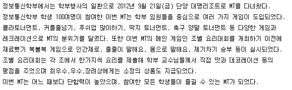 본문 시작 홈으로 SMIT 소식 SMIT 소개 SMIT 교육 SMIT 취업 SMIT 소식 SMIT 입학 홈페이지가이드 갤러리 공지사항 갤러리 경진대회 동아리 갤러리 페이스북 트위터 프린트 기업체험과 ACE 프로그램 일환 KT 견학 오선진 7406 2012-11-04 일시 : 2012년 10월 26일(금) 09:30 -18:00대상 : 정보통신학부 3,4학년 (70명)인솔 : 오선진 학부장, 이성재 교수출발장소 : 전산정보학관 앞 목록 이전2012년도 정보통신학부 연합 MT 다음 미드필더인증제 봉사활동 실시 담당부서 : 스마트IT학부 담당자 : - 연락처 : 043-649-1275 최종수정일 : 2024-10-26 만족도조사 만족도 조사 이 페이지에서 제공하는 정보에 대하여 만족하시나요? 매우만족 만족 보통 불만족 매우불만족